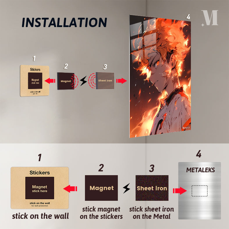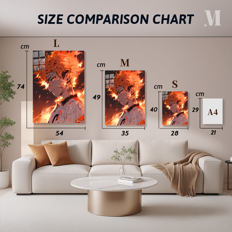 Shoyo Hinata from “Haikyuu!!” has fiery orange hair and wears a white jersey with orange accents. Metaleks Ultra HD Metal Poster – Create Your Passionate Space.