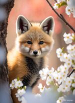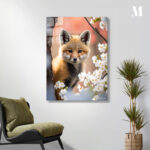 A fox with brown and white fur peeks from behind a tree, surrounded by white flowers. Metaleks Ultra HD Metal Poster – Create Your Passionate Space.
