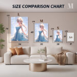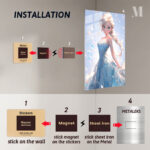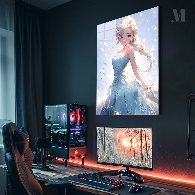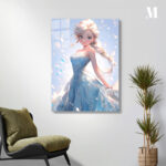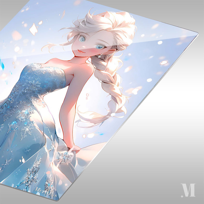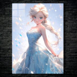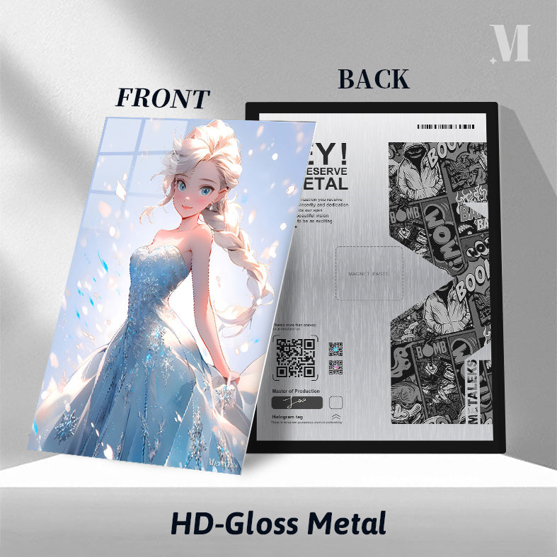 Elsa from Frozen is depicted in a beautiful blue dress with intricate snowflake patterns. Her long, braided blonde hair flows elegantly, and she has a serene expression on her face. Metaleks Ultra HD Metal Poster – Create Your Passionate Space.