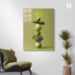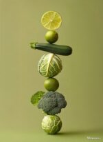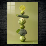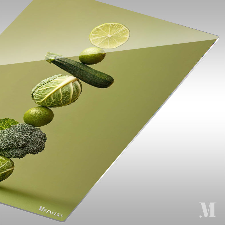 A lime slice, a whole lime, a zucchini, a cabbage, another lime, a broccoli floret, and another cabbage are stacked vertically. Metaleks Ultra HD Metal Poster – Create Your Passionate Space.