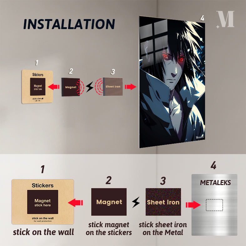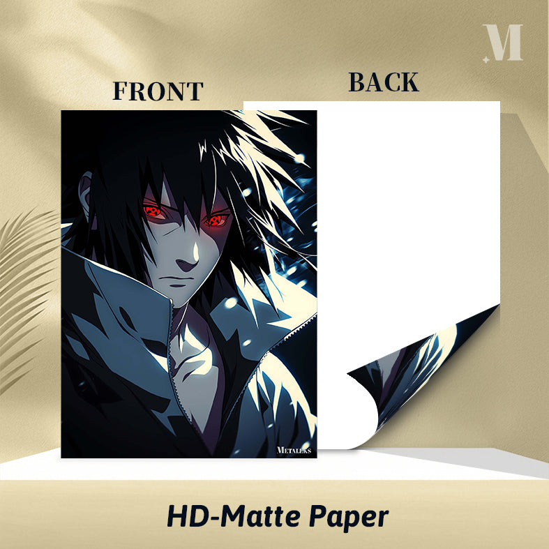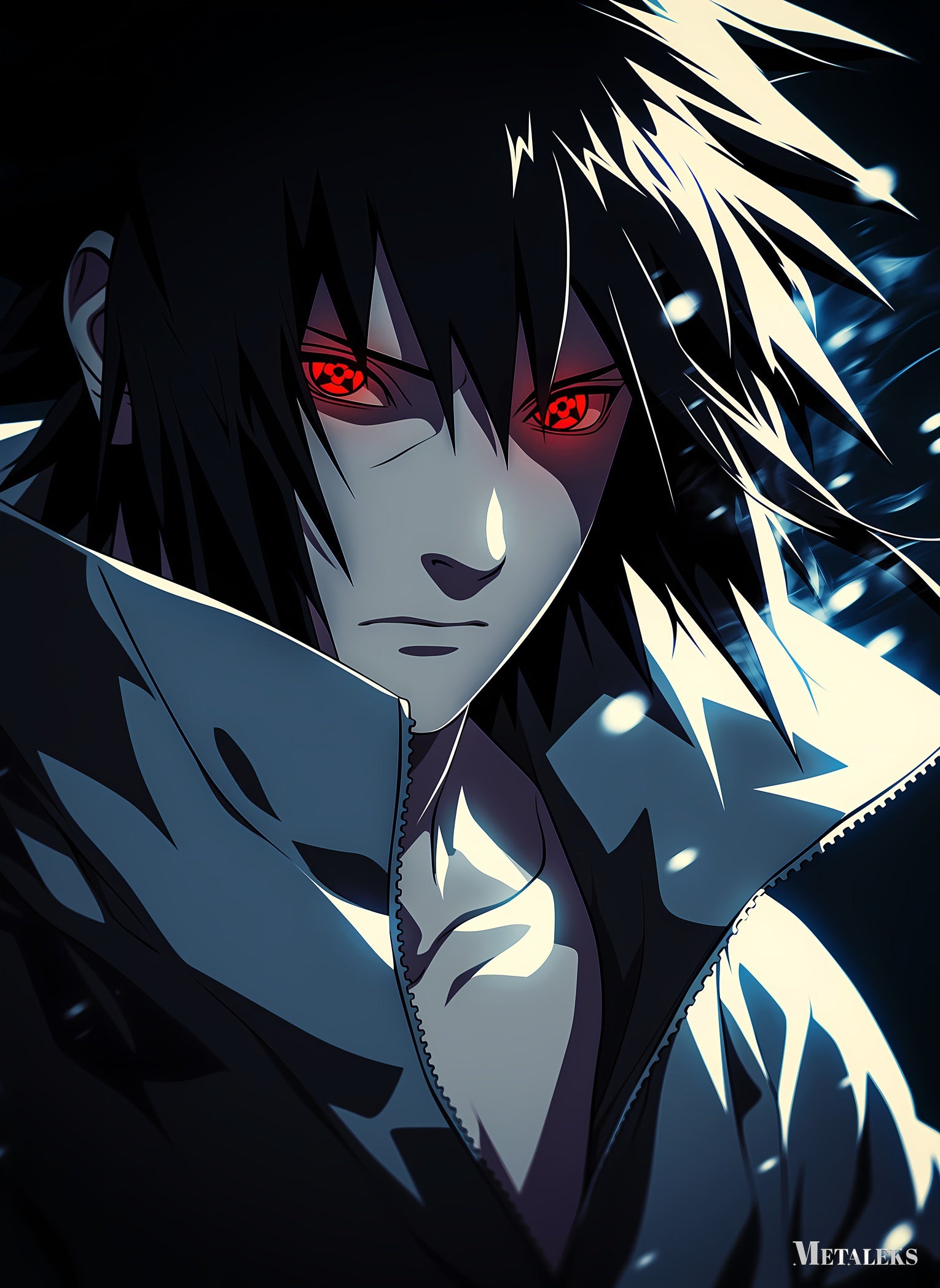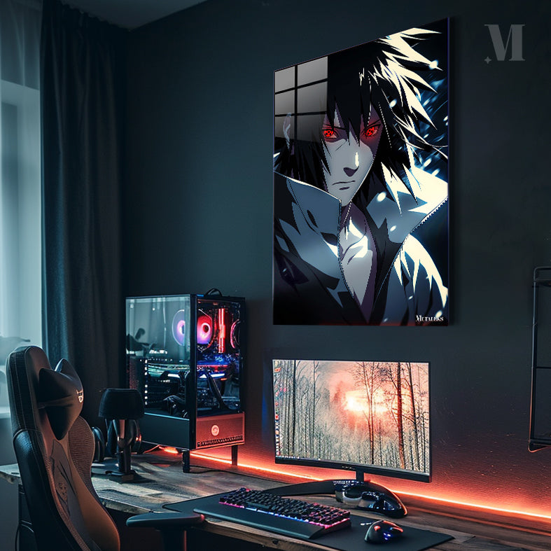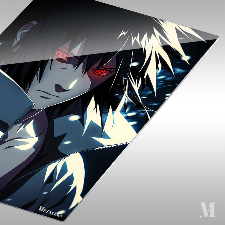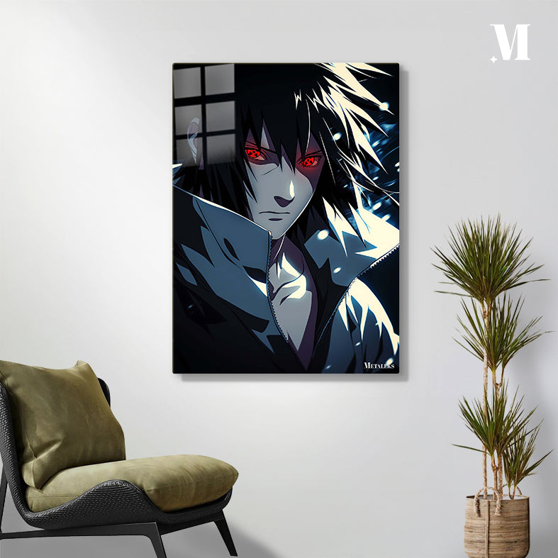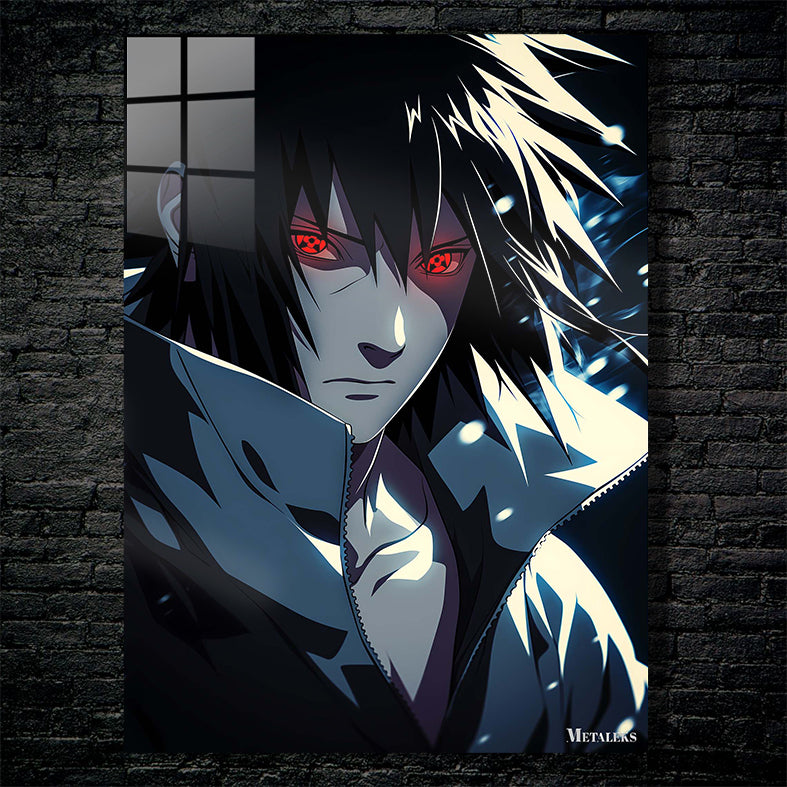 Uchiha Madara from the anime “Naruto” has long black hair, red eyes with a special pattern, and is wearing a dark jacket with a high collar. Metaleks Ultra HD Metal Poster – Create Your Passionate Space.