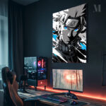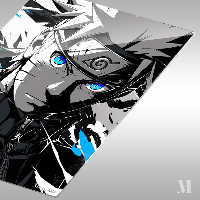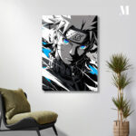 Kakashi Hatake from Naruto has spiky silver hair, blue eyes, and wears a black outfit with a forehead protector. Metaleks Ultra HD Metal Poster – Create Your Passionate Space.