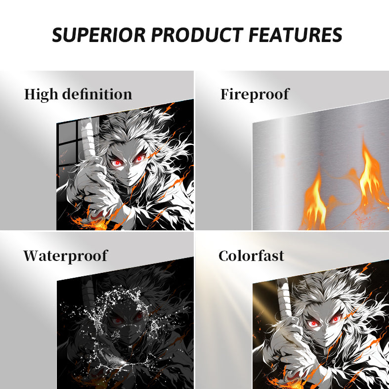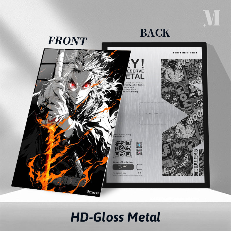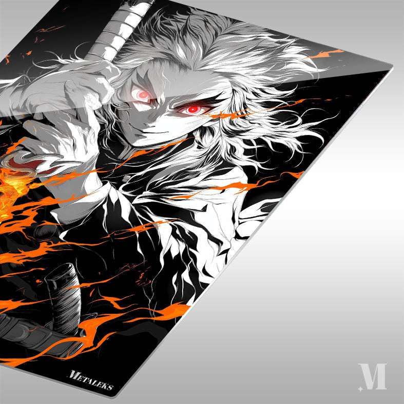 Demon Slayer’s Rengoku Kyojuro holds a sword with fiery effects, eyes glowing red. Metaleks Ultra HD Metal Poster – Create Your Passionate Space.