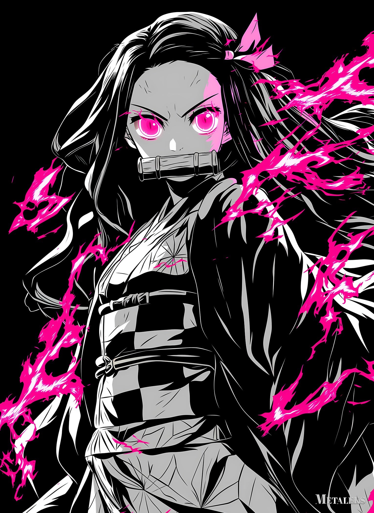 The subject is Nezuko Kamado from the work Demon Slayer: Kimetsu no Yaiba. She has long black hair with a pink bow, pink eyes, and is wearing a checkered haori over a kimono. There are pink flames around her. Metaleks Ultra HD Metal Poster – Create Your Passionate Space.