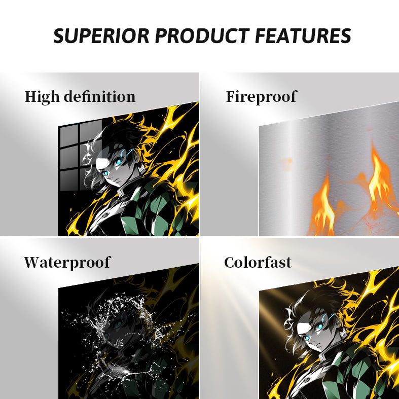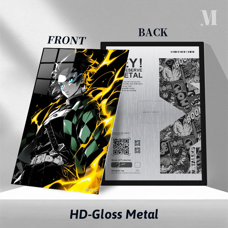 Tanjiro Kamado from Demon Slayer, with glowing blue eyes and surrounded by yellow lightning-like effects, wears a green and black checkered haori and a sword at his waist. Metaleks Ultra HD Metal Poster – Create Your Passionate Space.