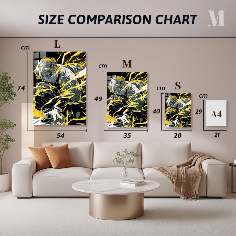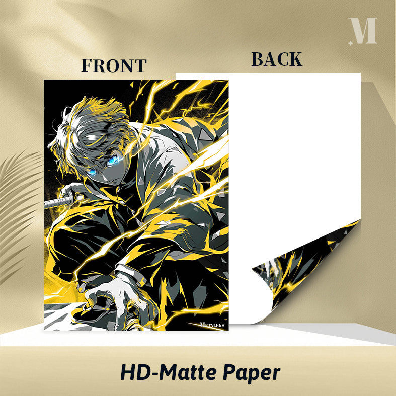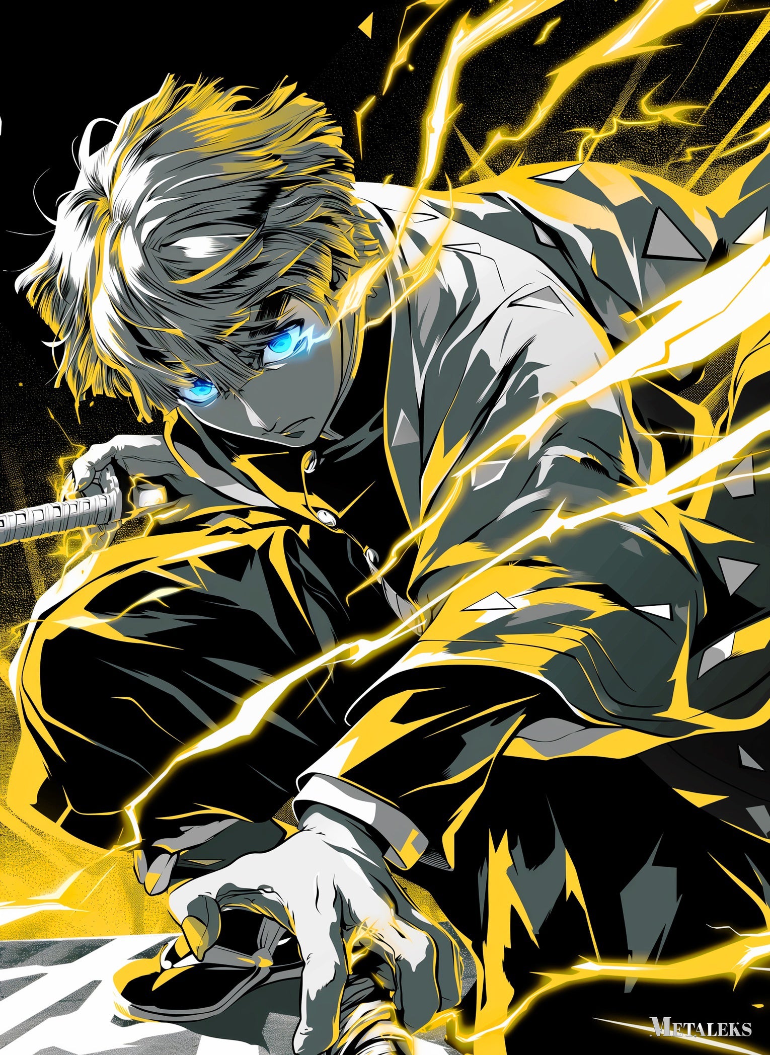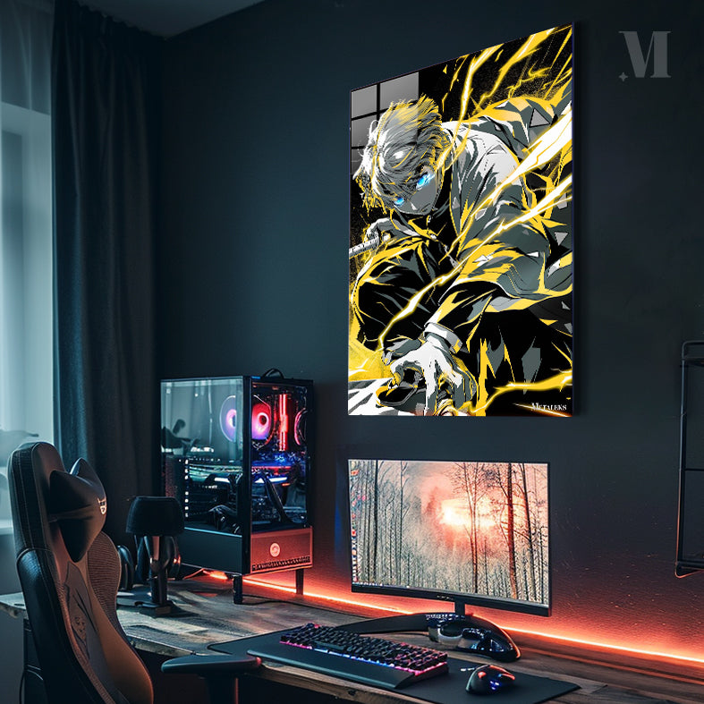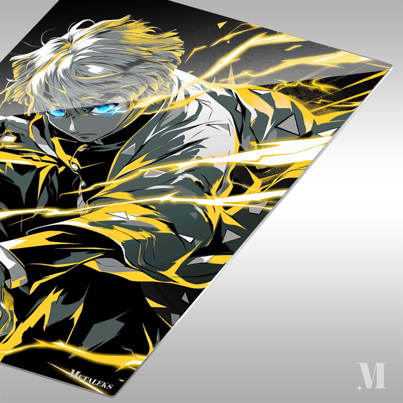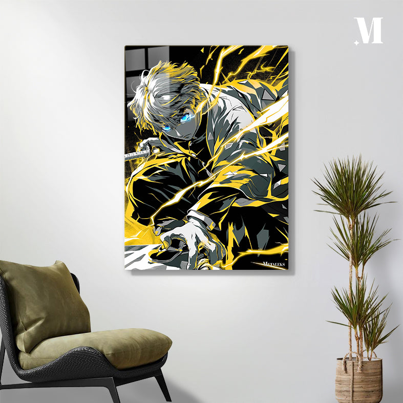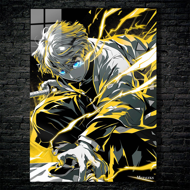 The character is Zenitsu Agatsuma from Demon Slayer. He has spiky blonde hair, blue glowing eyes, and is wearing a traditional Japanese outfit. He is surrounded by yellow lightning effects and is holding a sword. Metaleks Ultra HD Metal Poster – Create Your Passionate Space.