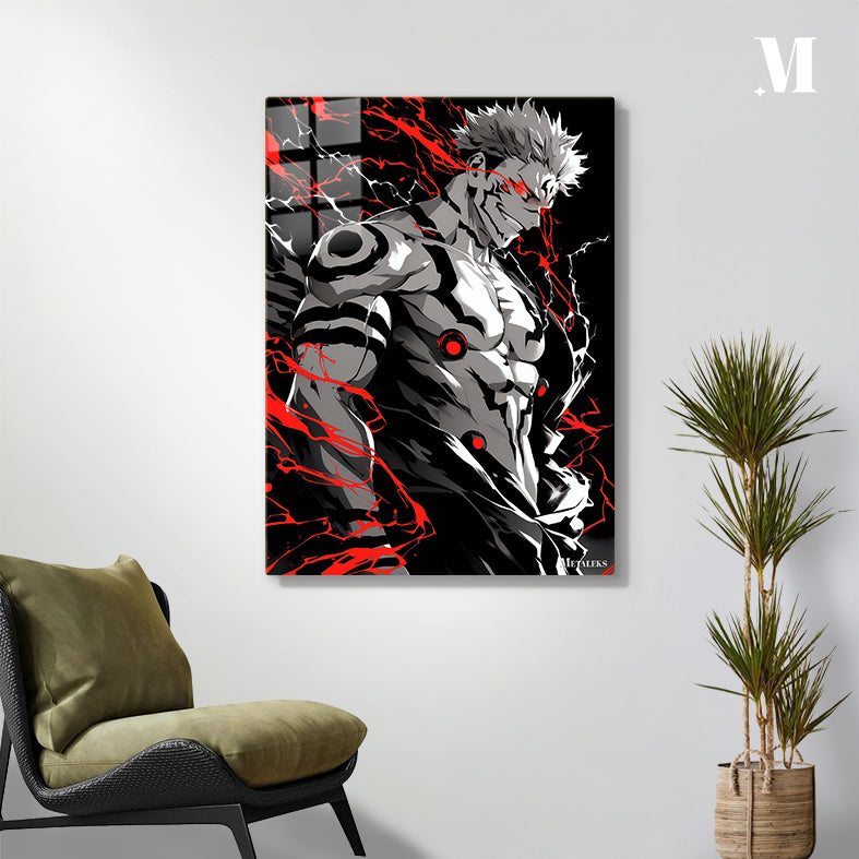 Gojo Satoru from Jujutsu Kaisen has spiky white hair and red eyes. His body is muscular with black markings and red circular spots. Metaleks Ultra HD Metal Poster – Create Your Passionate Space.