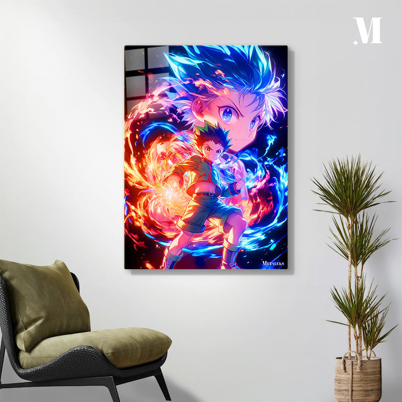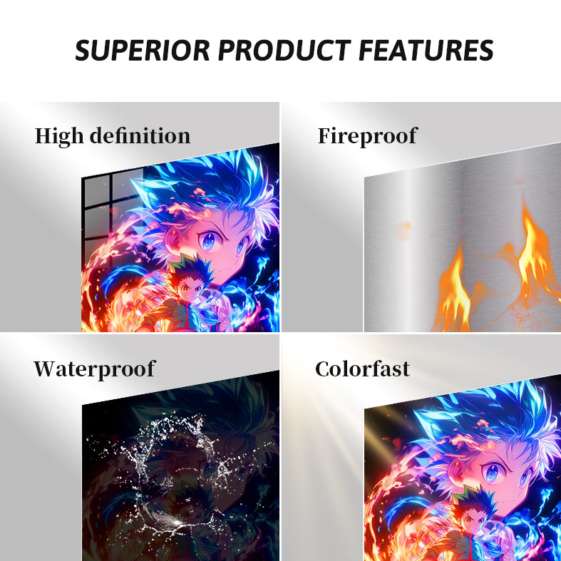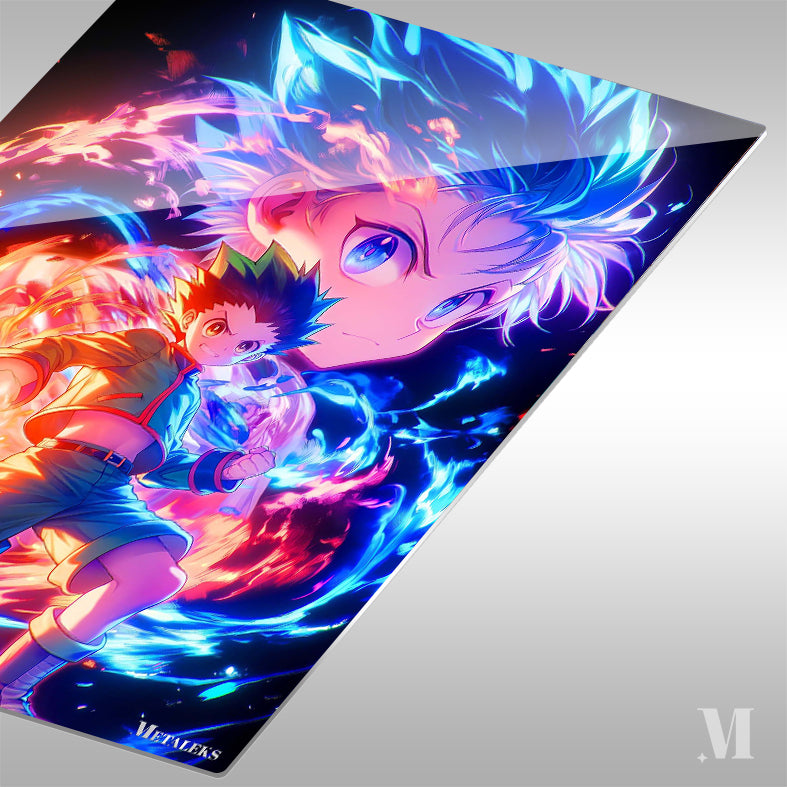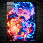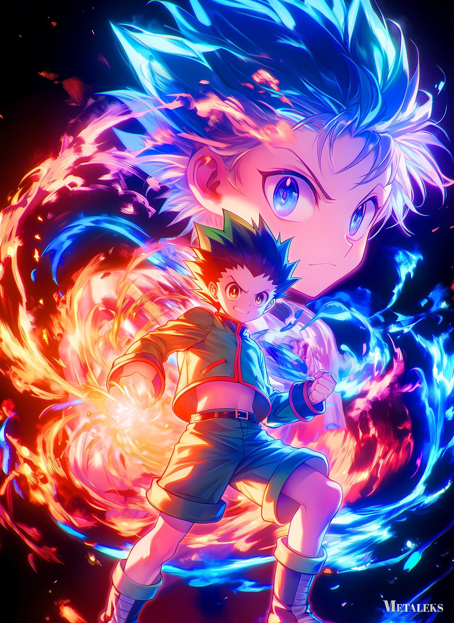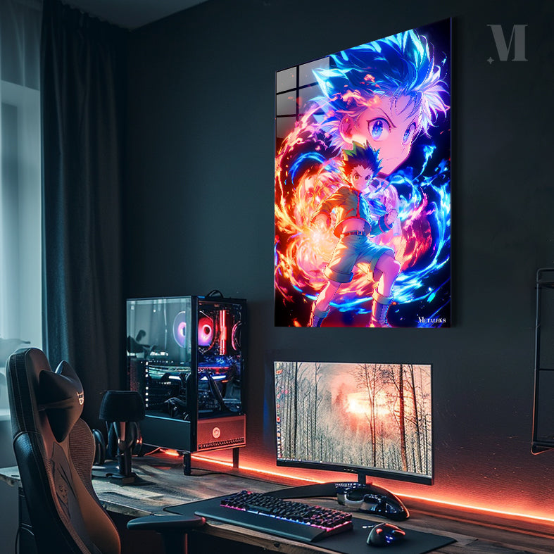 Gon Freecss from Hunter × Hunter is depicted in a dynamic pose with glowing energy swirling around him. Metaleks Ultra HD Metal Poster – Create Your Passionate Space.