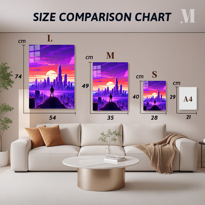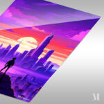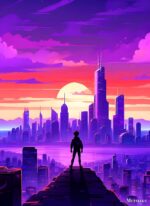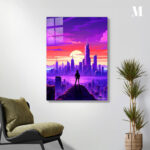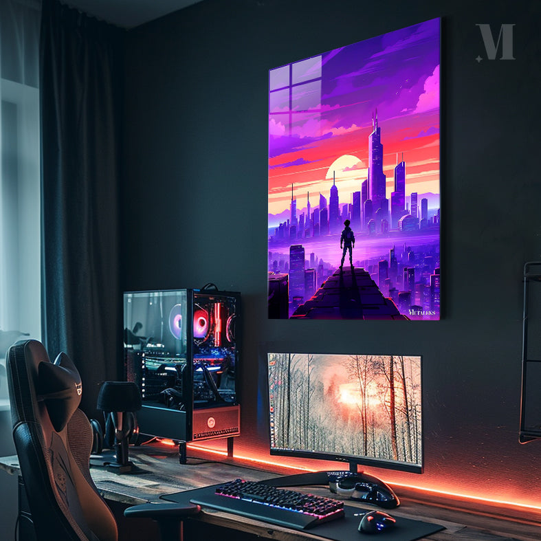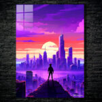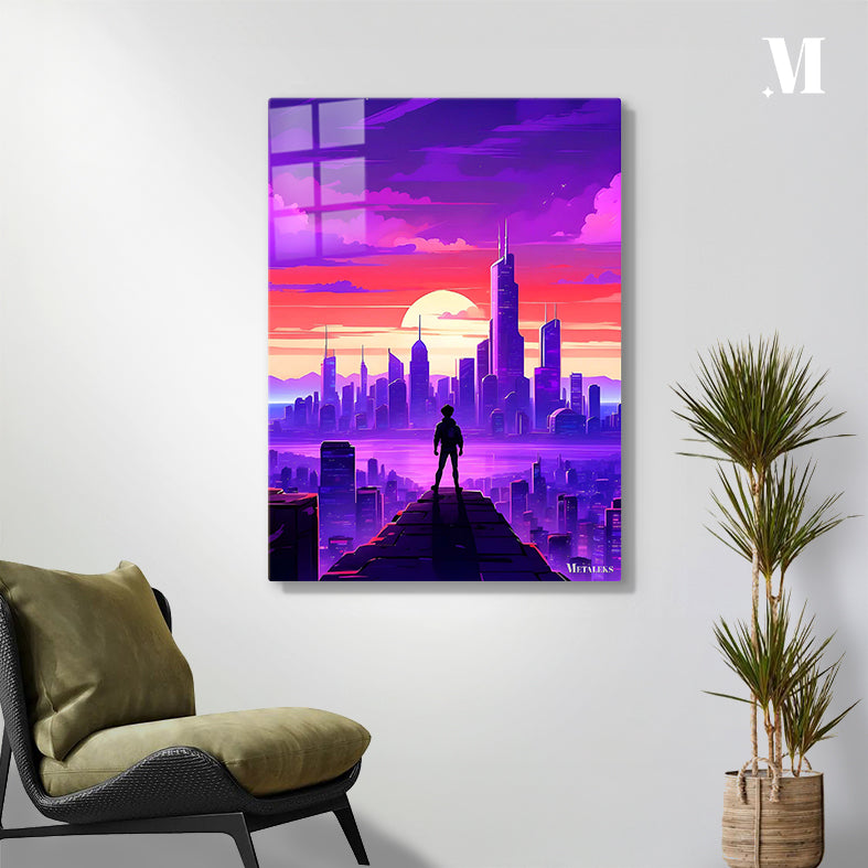 A person stands on a high platform overlooking a cityscape during sunset. The sky is a gradient of purple and pink, with clouds scattered across it. The city below is filled with tall buildings, and the sun is setting in the background, casting a warm glow over the scene. Metaleks Ultra HD Metal Poster – Create Your Passionate Space.