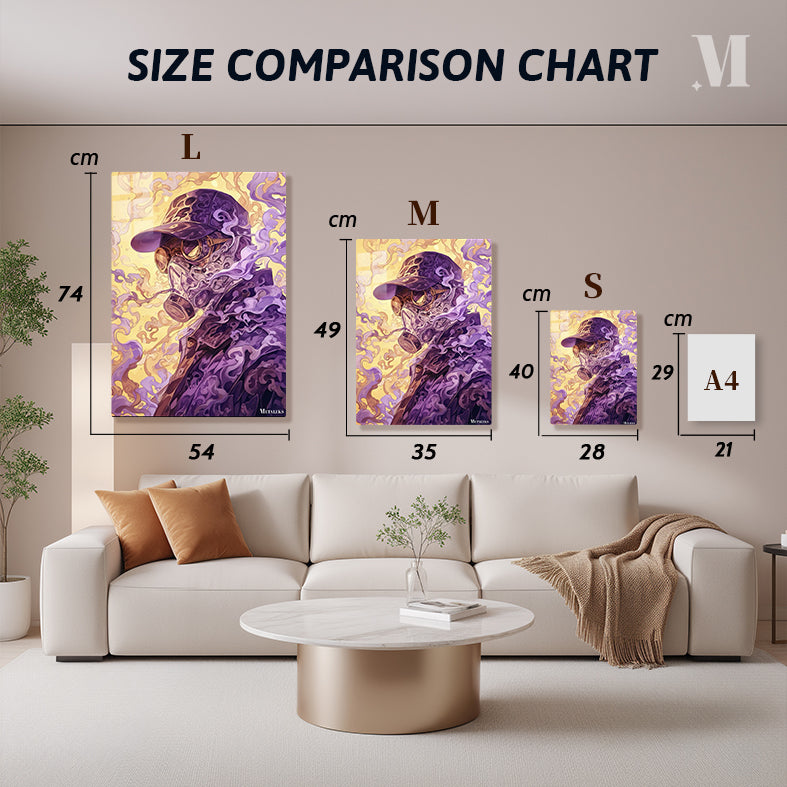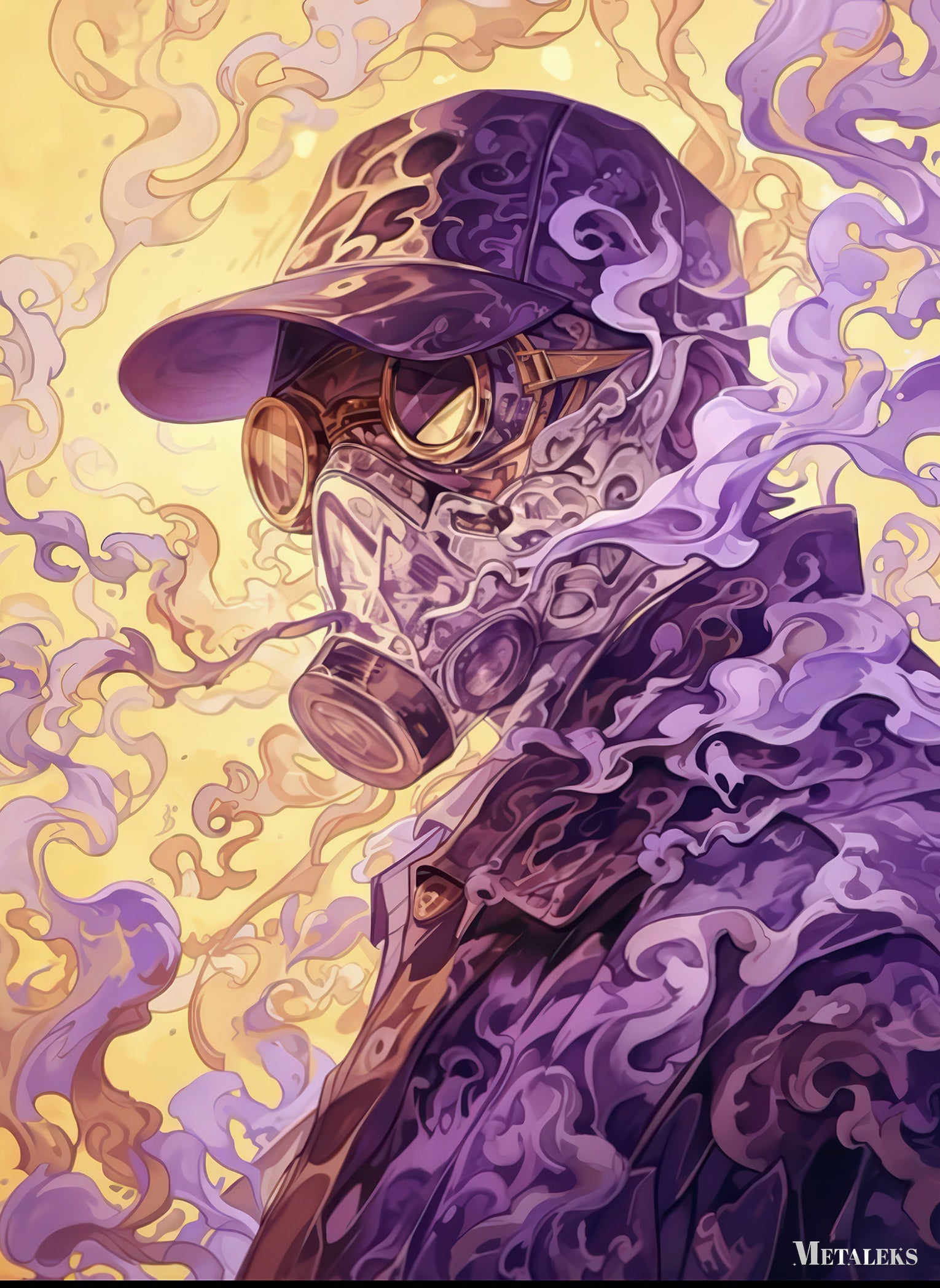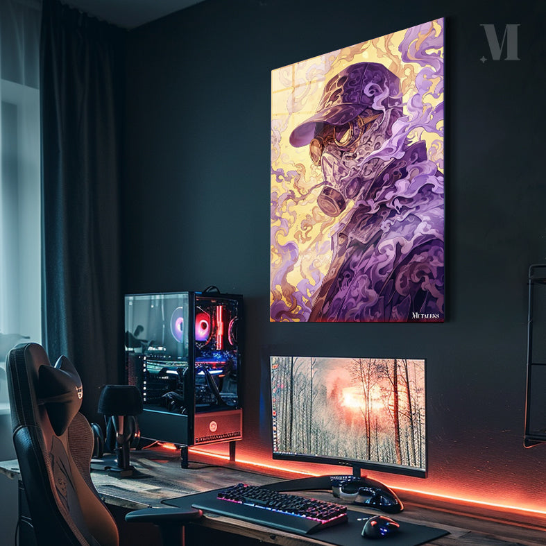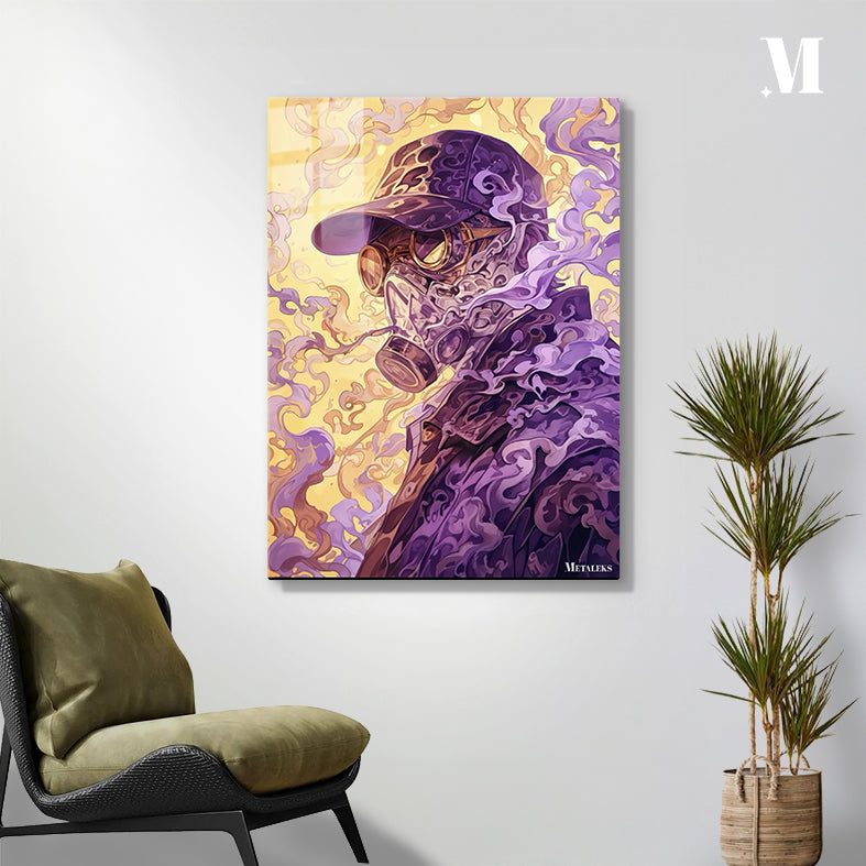A person wearing a gas mask and a cap. The gas mask has a mechanical appearance with intricate designs, and the person is surrounded by swirling purple and yellow smoke. Metaleks Ultra HD Metal Poster – Create Your Passionate Space.