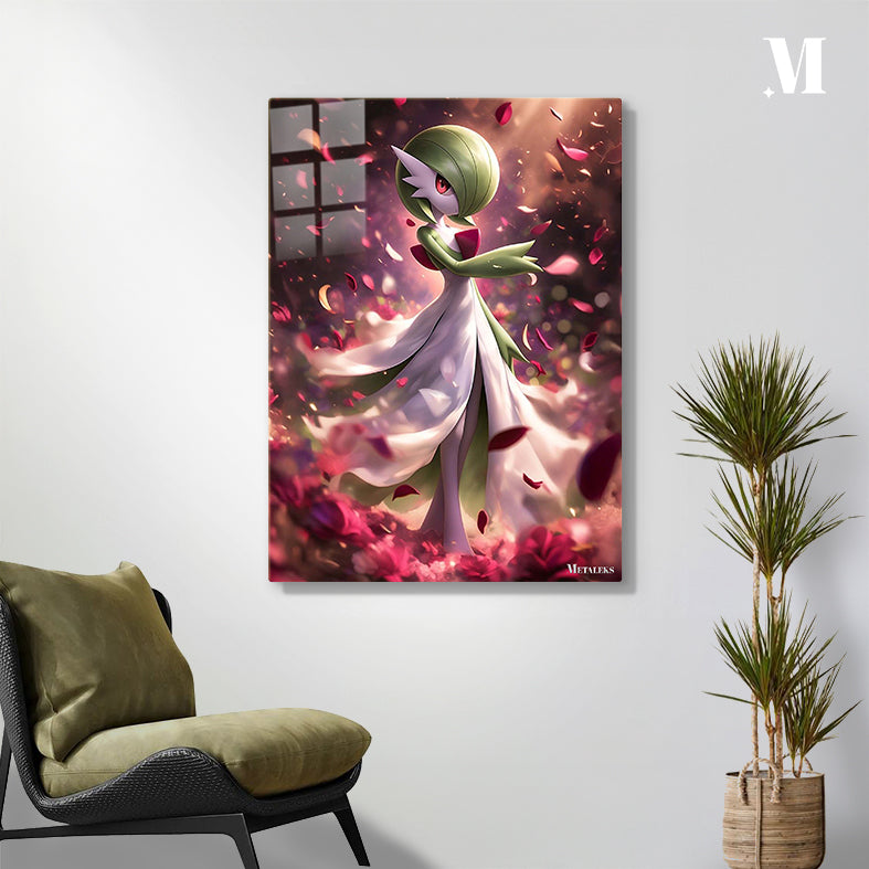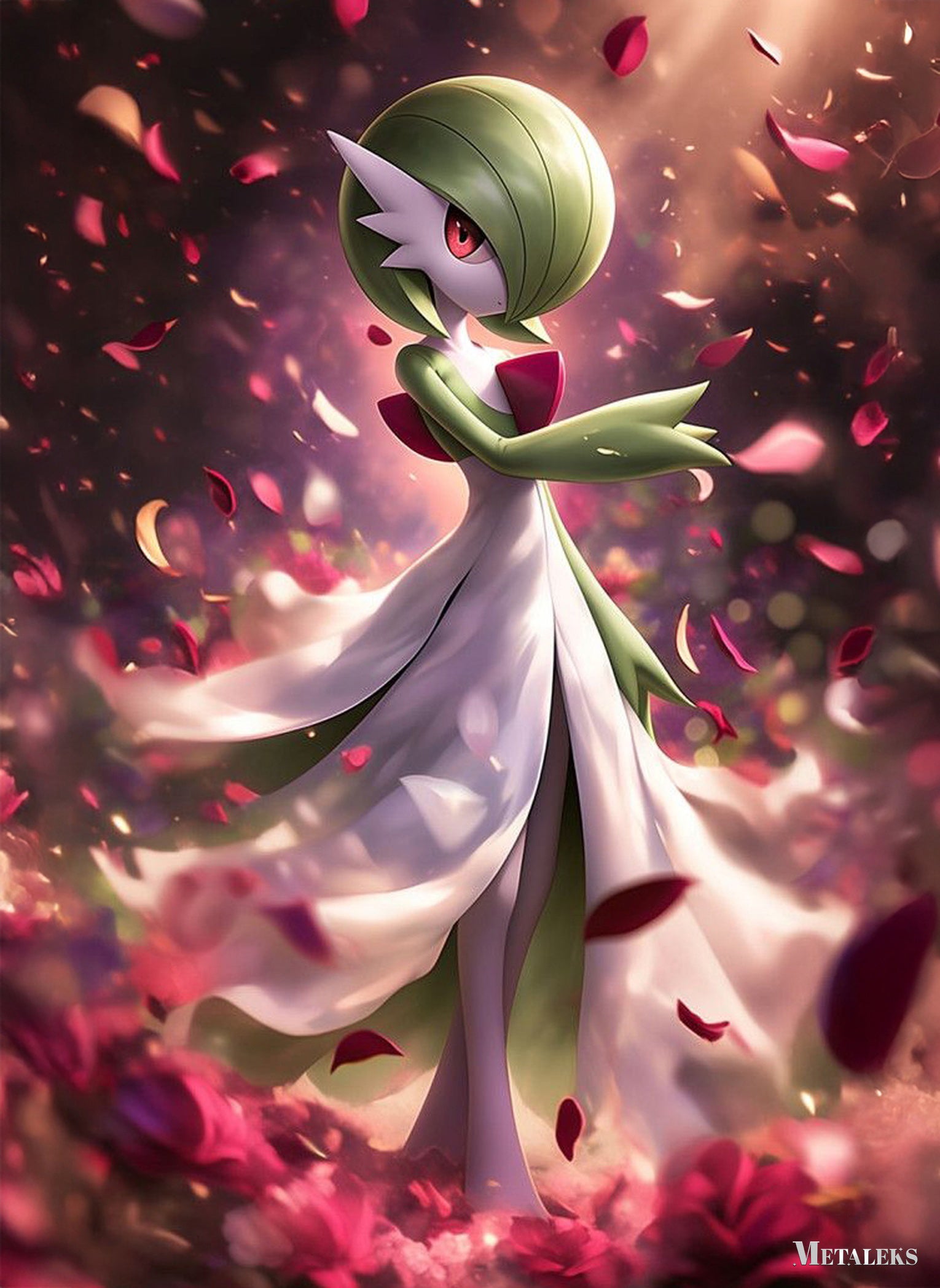 Gardevoir from Pokémon stands gracefully in a flowing white dress, accented by red bow-like features. Rose petals swirl around her.