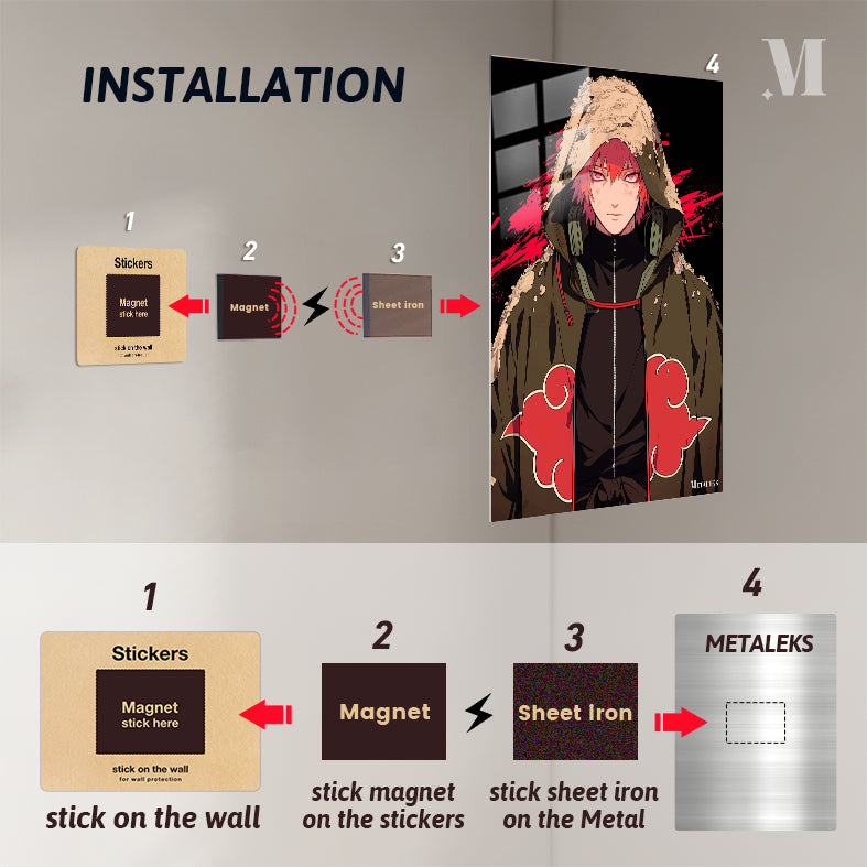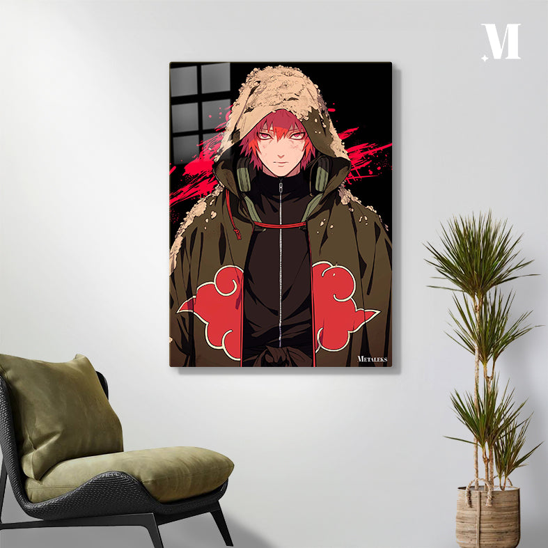 Pain from the anime Naruto is shown wearing a hooded cloak with red cloud patterns, red hair, and red eyes. Metaleks Ultra HD Metal Poster – Create Your Passionate Space.