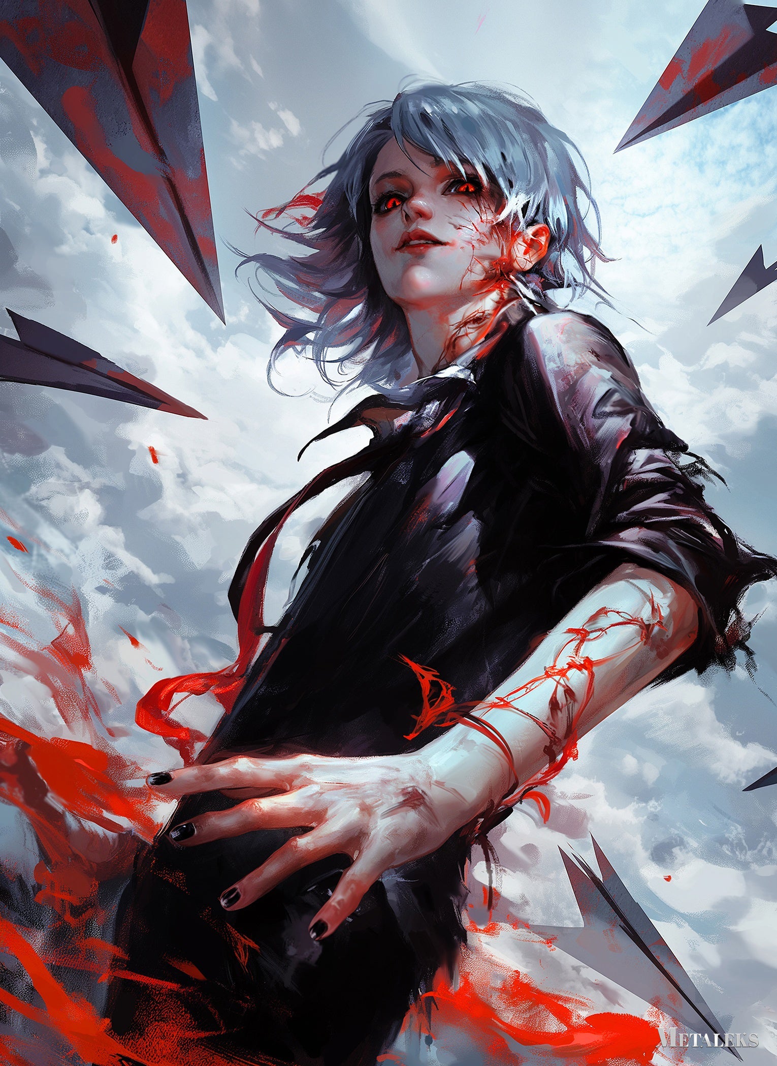 A character with silver hair, wearing a black outfit, has red glowing eyes and red veins on their arm and face. Metaleks Ultra HD Metal Poster – Create Your Passionate Space.