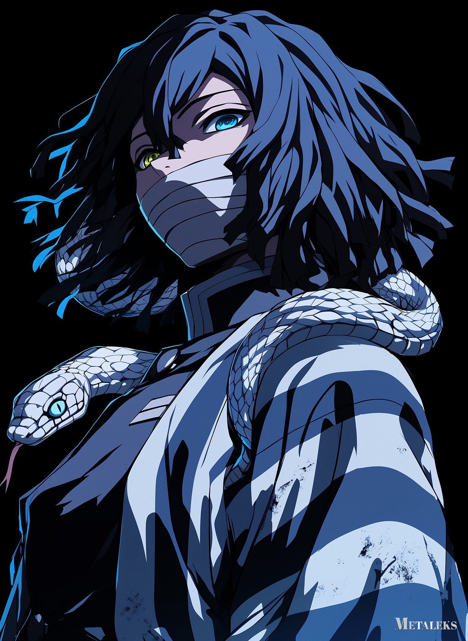 Shoto Todoroki from My Hero Academia with a snake around his neck. Metaleks Ultra HD Metal Poster – Create Your Passionate Space.