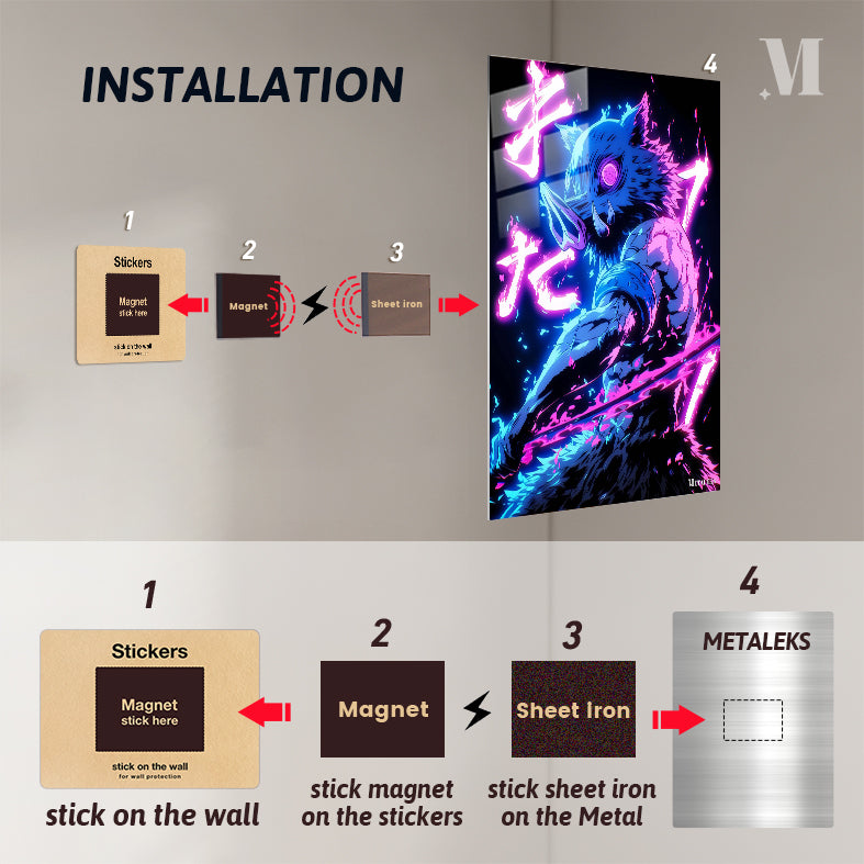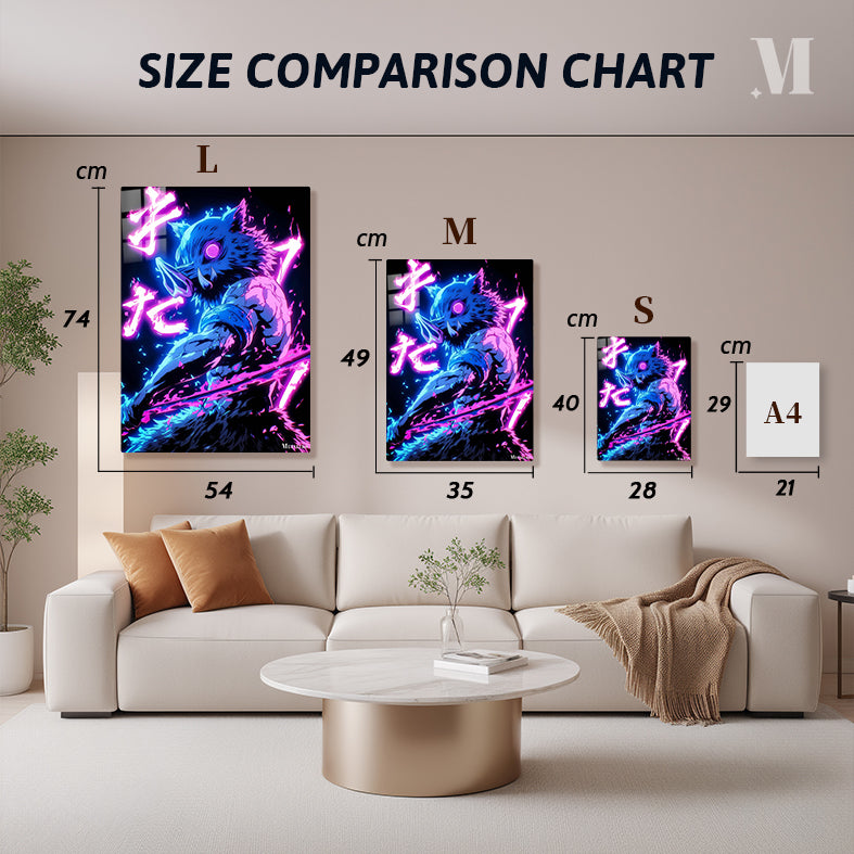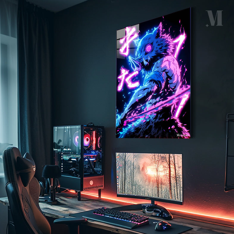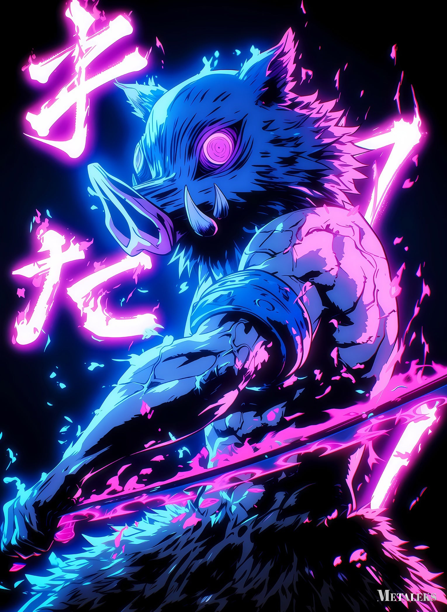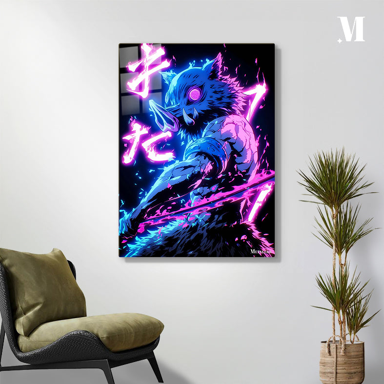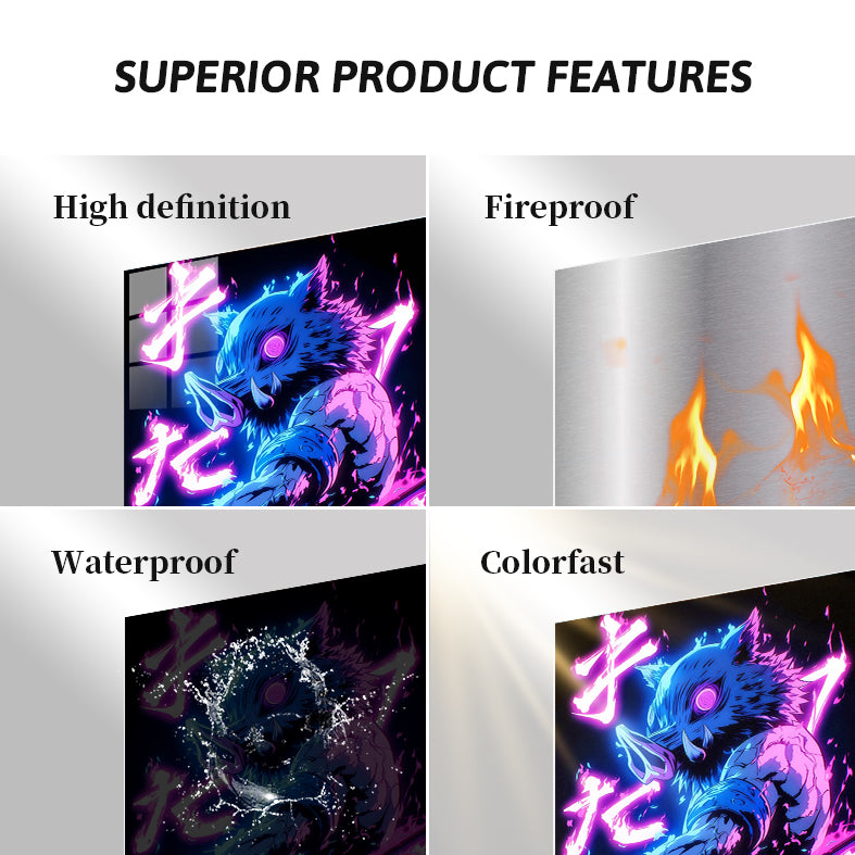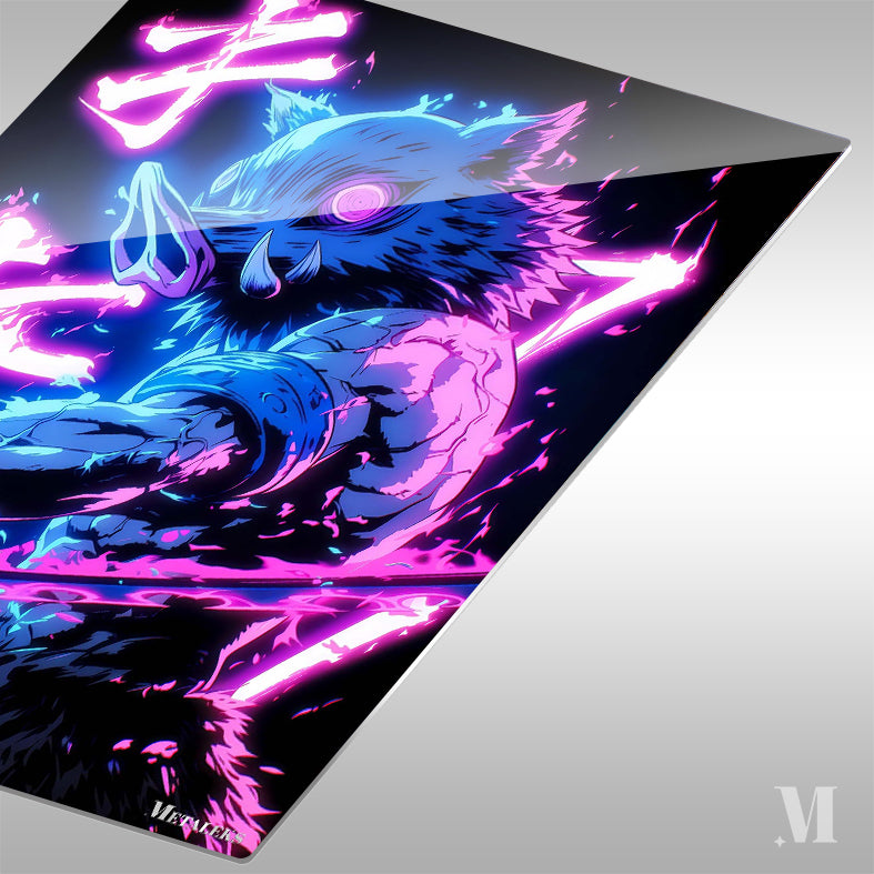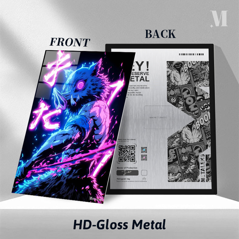 Inosuke Hashibira from Demon Slayer is depicted with a boar’s head, muscular build, and wielding a sword. The character is surrounded by vibrant neon effects and Japanese text. Metaleks Ultra HD Metal Poster – Create Your Passionate Space.