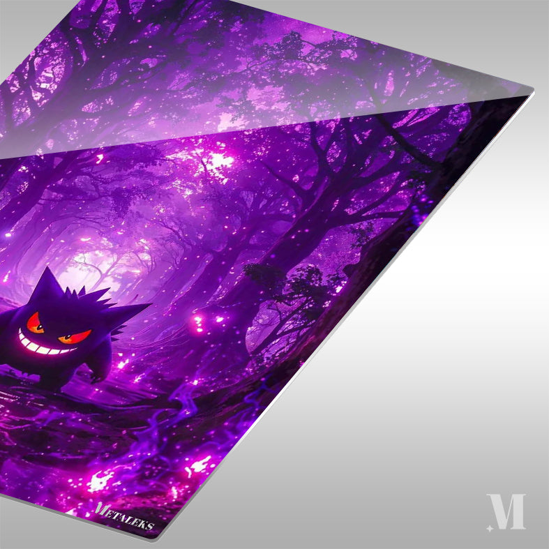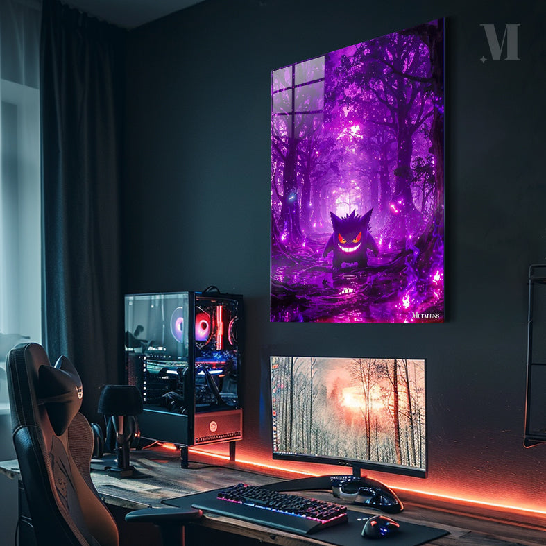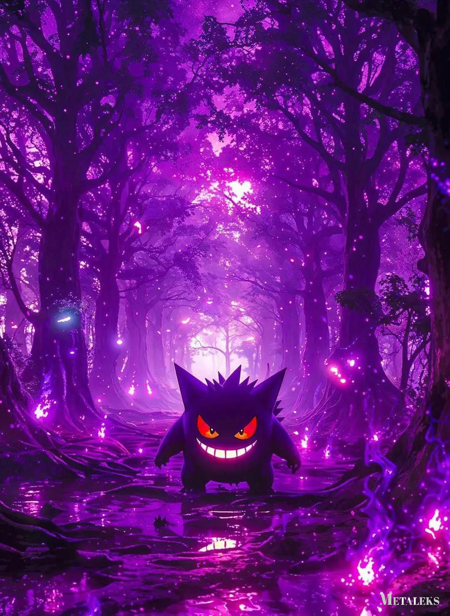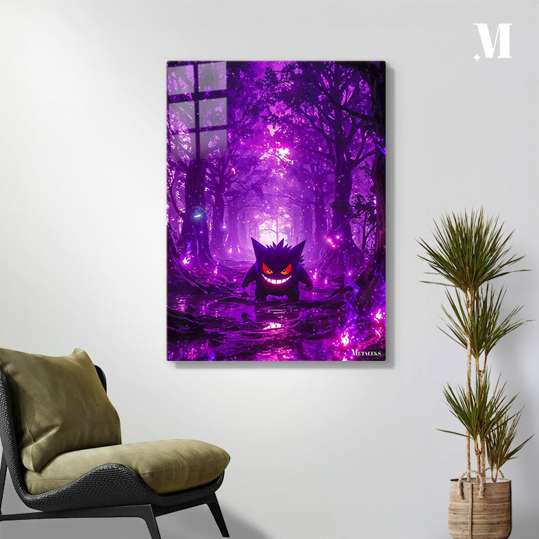 Gengar from Pokemon stands in a purple forest with a sinister smile.