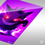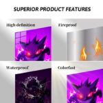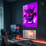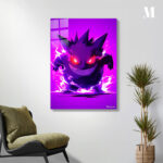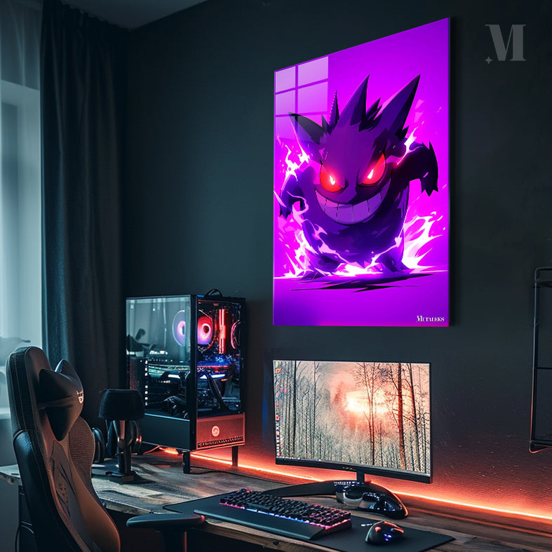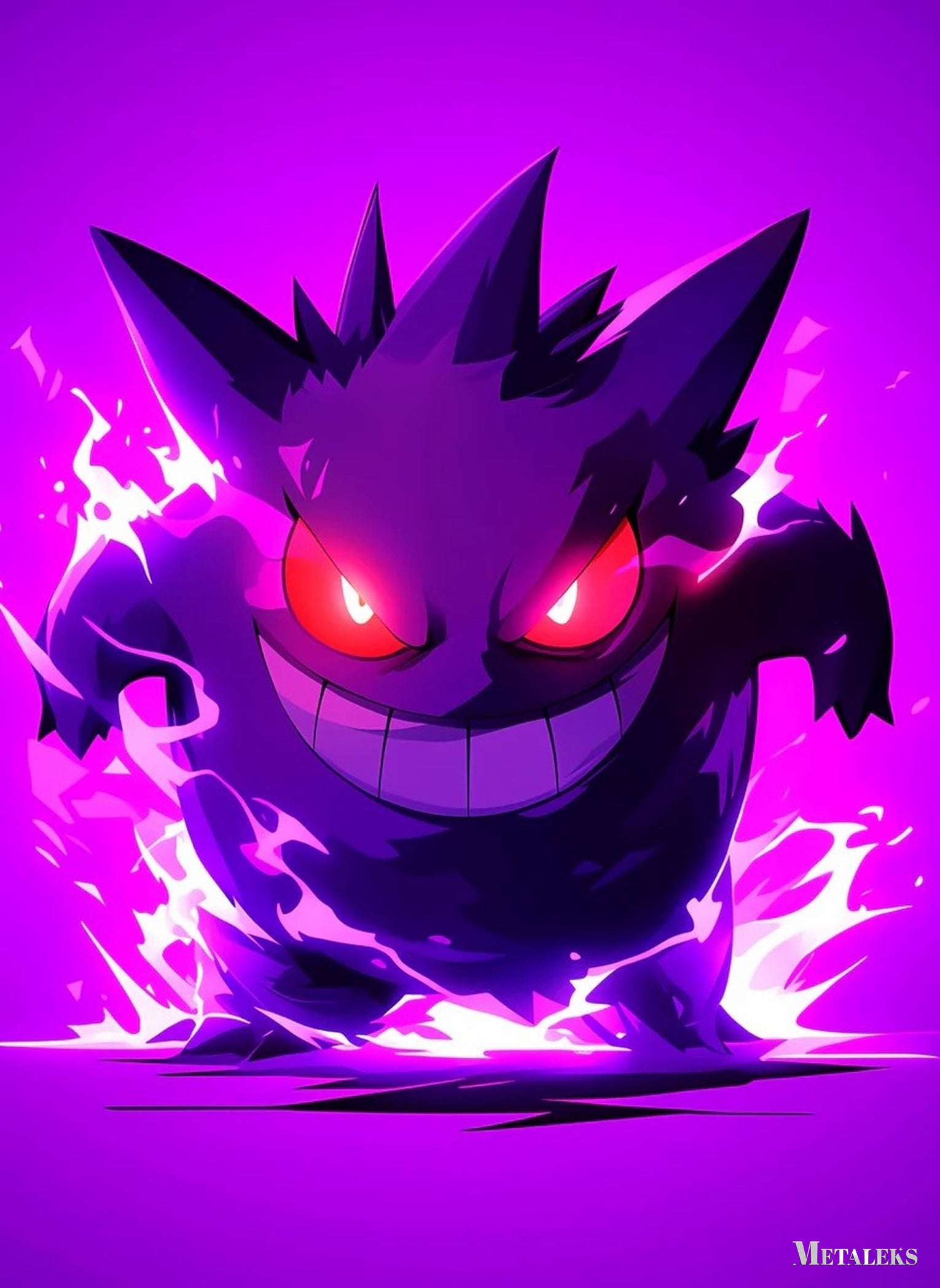 Gengar from Pokemon is depicted with a menacing grin and glowing red eyes, surrounded by a purple aura.
