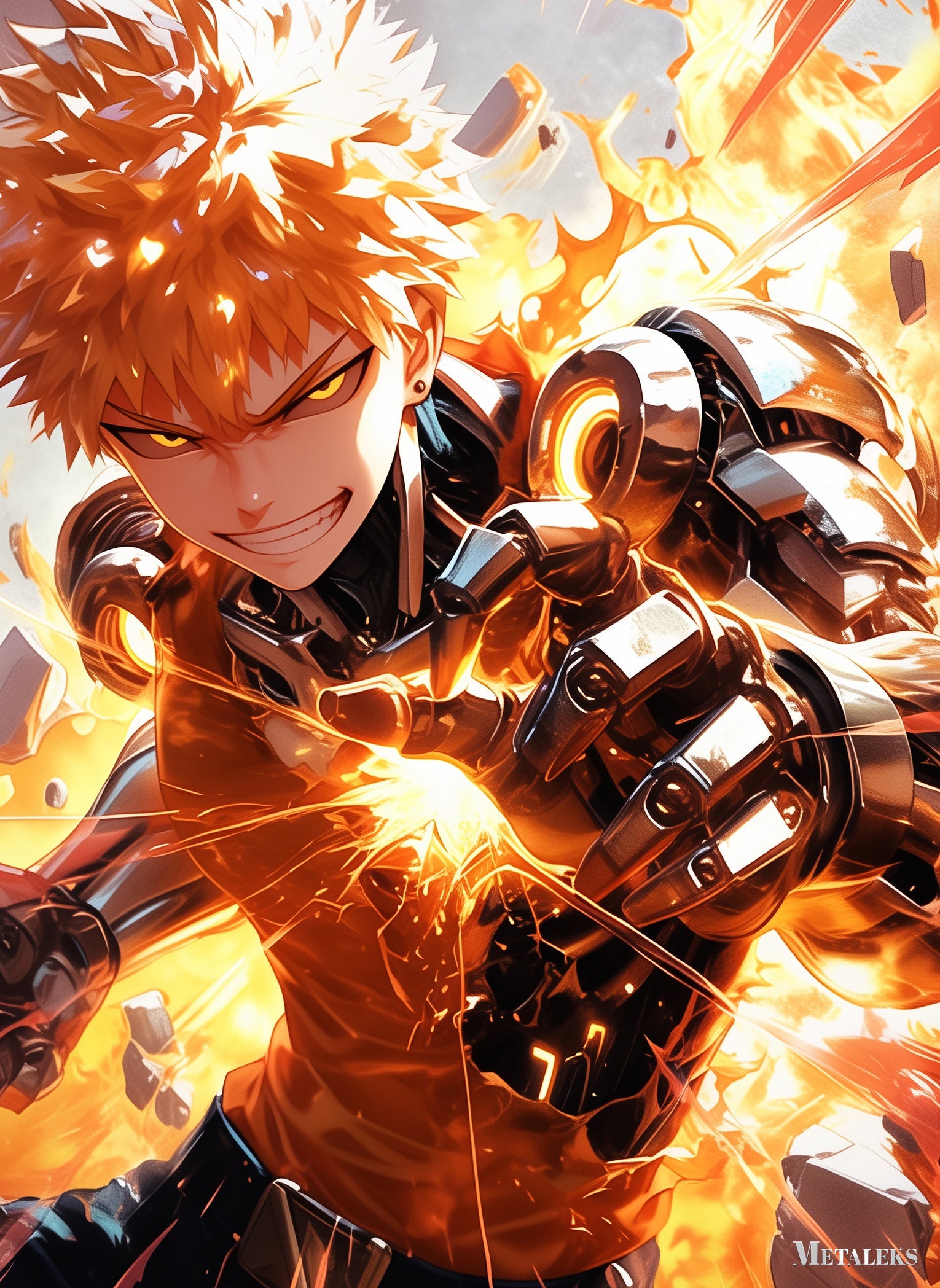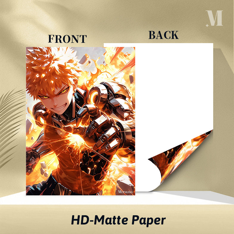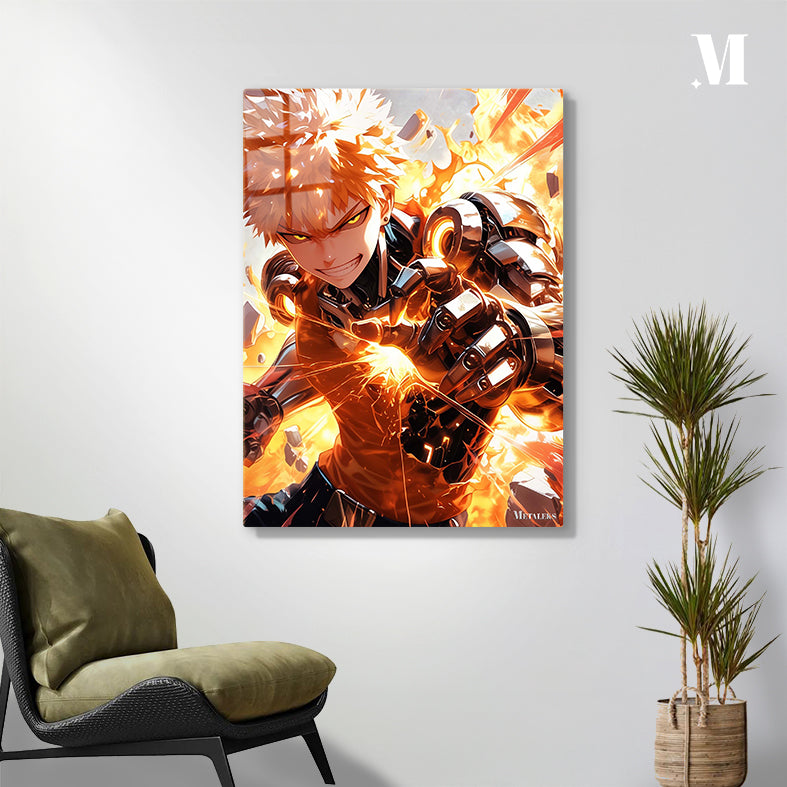 The character in the picture is Genos from the work “One-Punch Man.” He has spiky orange hair and glowing yellow eyes. He is wearing a mechanical suit with visible gears and armor. Genos appears to be in a combat stance, with his hands emitting energy and surrounded by flames and debris. Metaleks Ultra HD Metal Poster – Create Your Passionate Space.