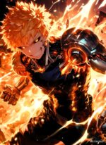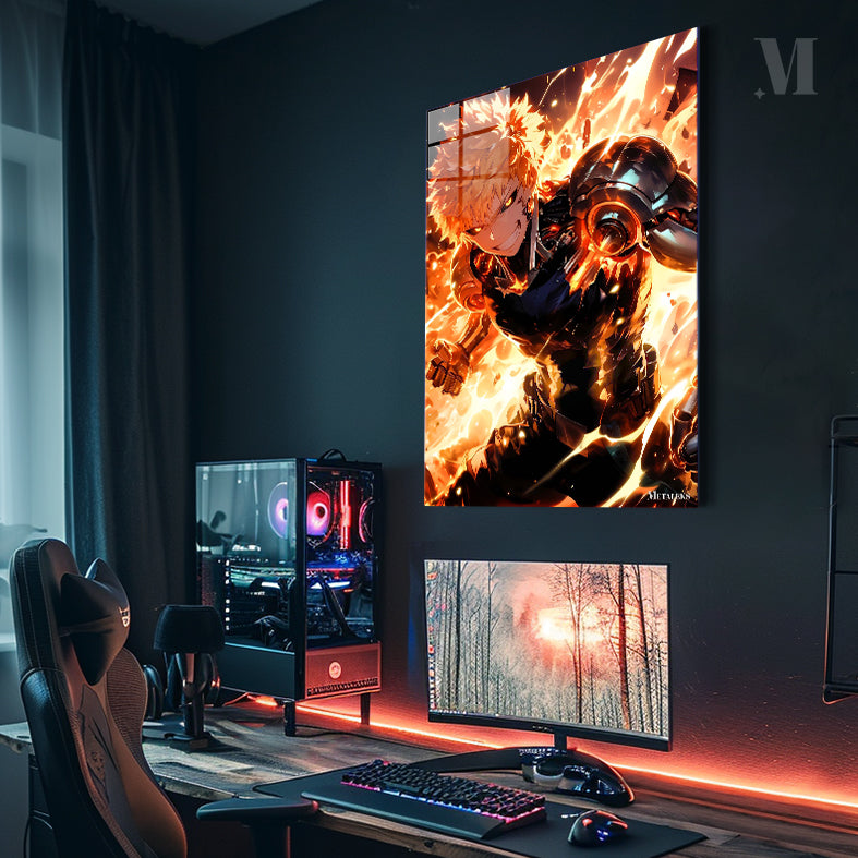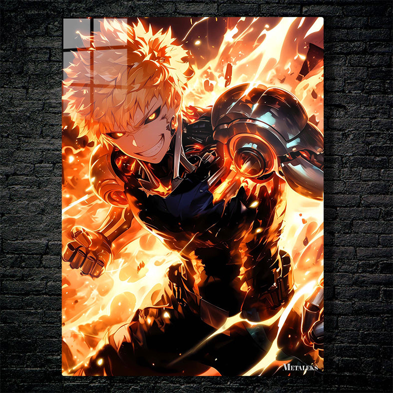 The character in the picture is Izuku Midoriya from the anime “My Hero Academia.” He has spiky orange hair and is wearing a black and silver armored suit. His eyes are glowing with a fierce determination, and he is surrounded by flames. Metaleks Ultra HD Metal Poster – Create Your Passionate Space.