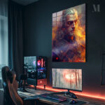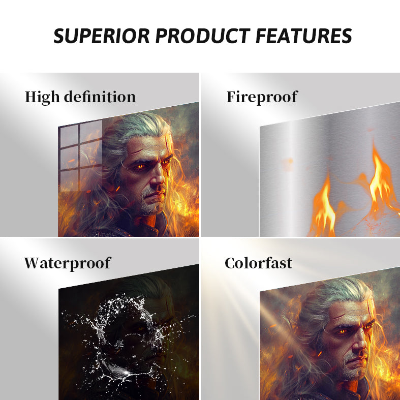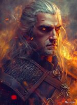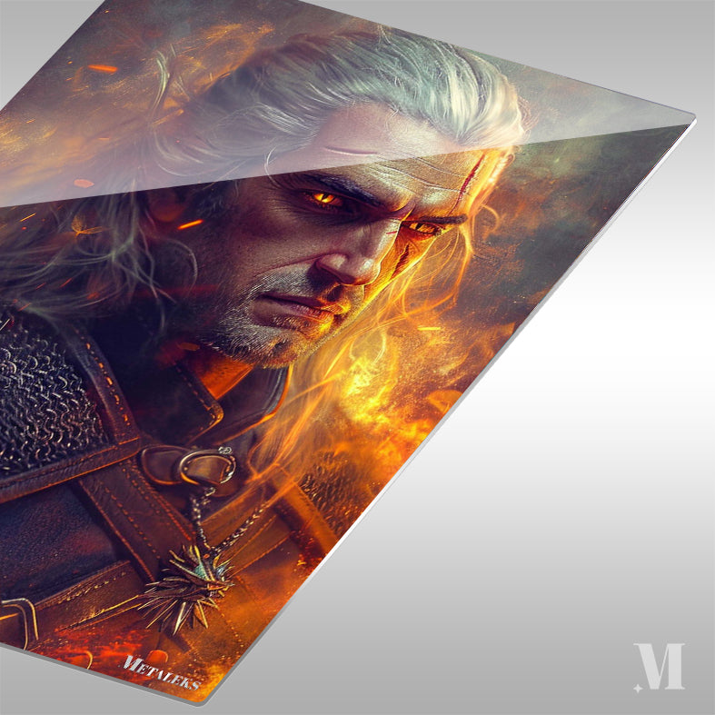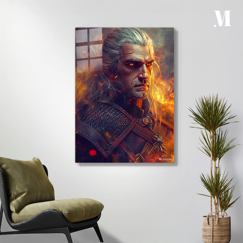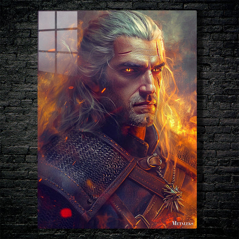 Geralt of Rivia from The Witcher has long white hair, a beard, and wears chainmail armor with a pendant. His eyes are glowing orange, and there is fire around him. Metaleks Ultra HD Metal Poster – Create Your Passionate Space.