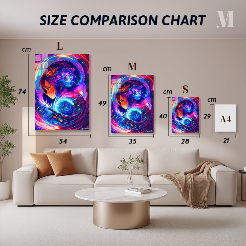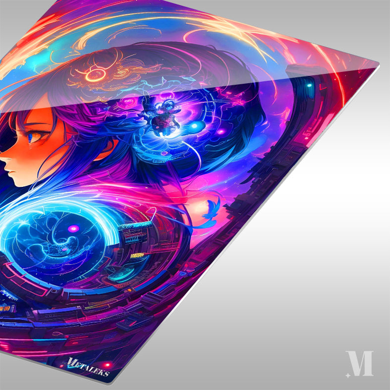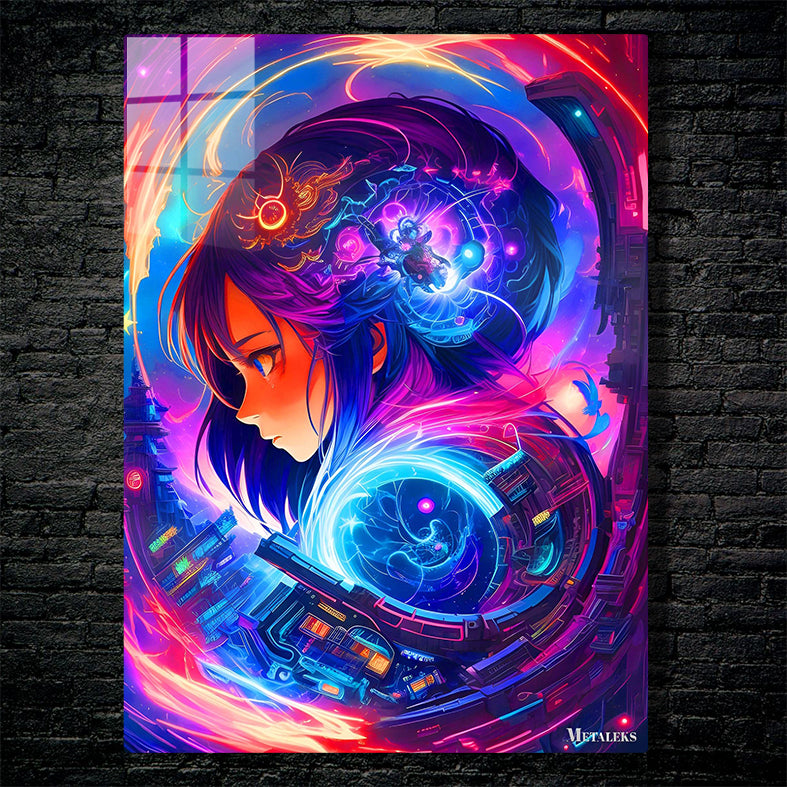 A girl with purple hair adorned with a mechanical hair accessory and a futuristic cityscape around her. Metaleks Ultra HD Metal Poster – Create Your Passionate Space.