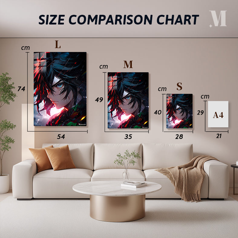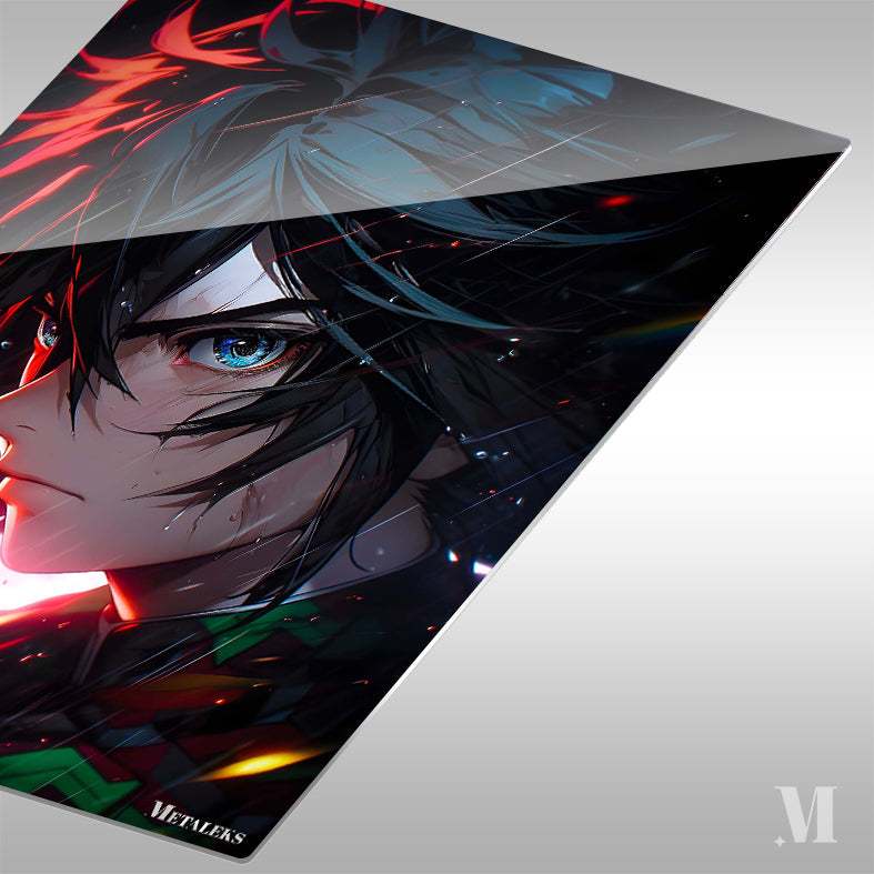Tanjiro Kamado from Demon Slayer: Kimetsu no Yaiba with blue eyes and black hair. Metaleks Ultra HD Metal Poster – Create Your Passionate Space.