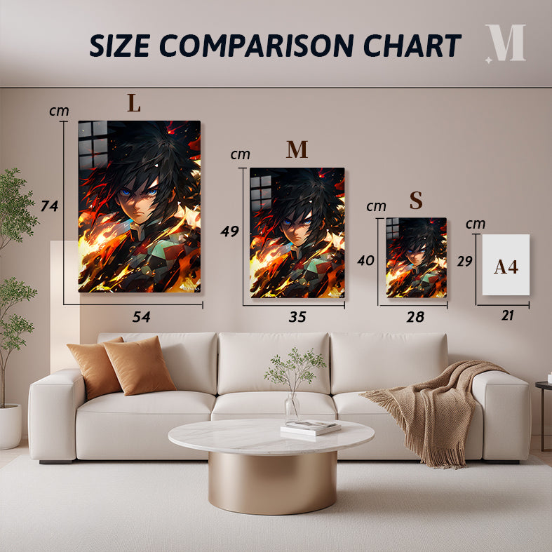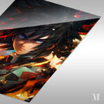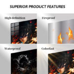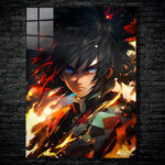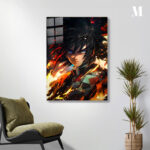 Tanjiro Kamado from Demon Slayer has black hair with red tips and blue eyes. He is wearing a checkered haori with flames around him. Metaleks Ultra HD Metal Poster – Create Your Passionate Space.