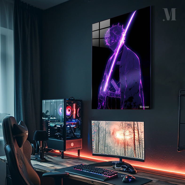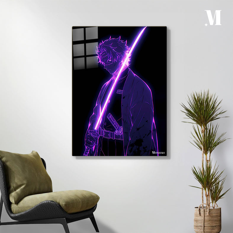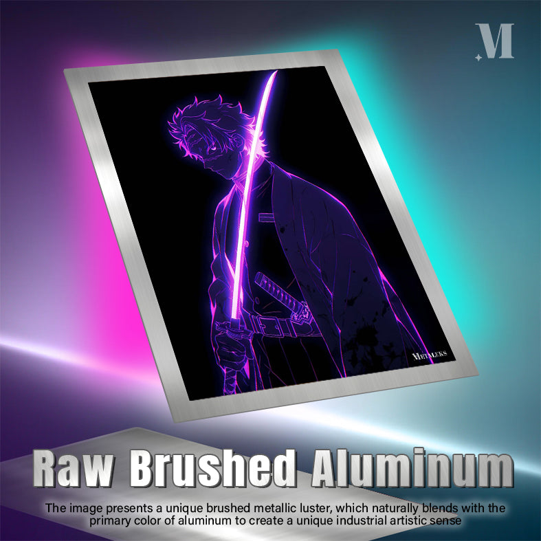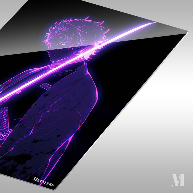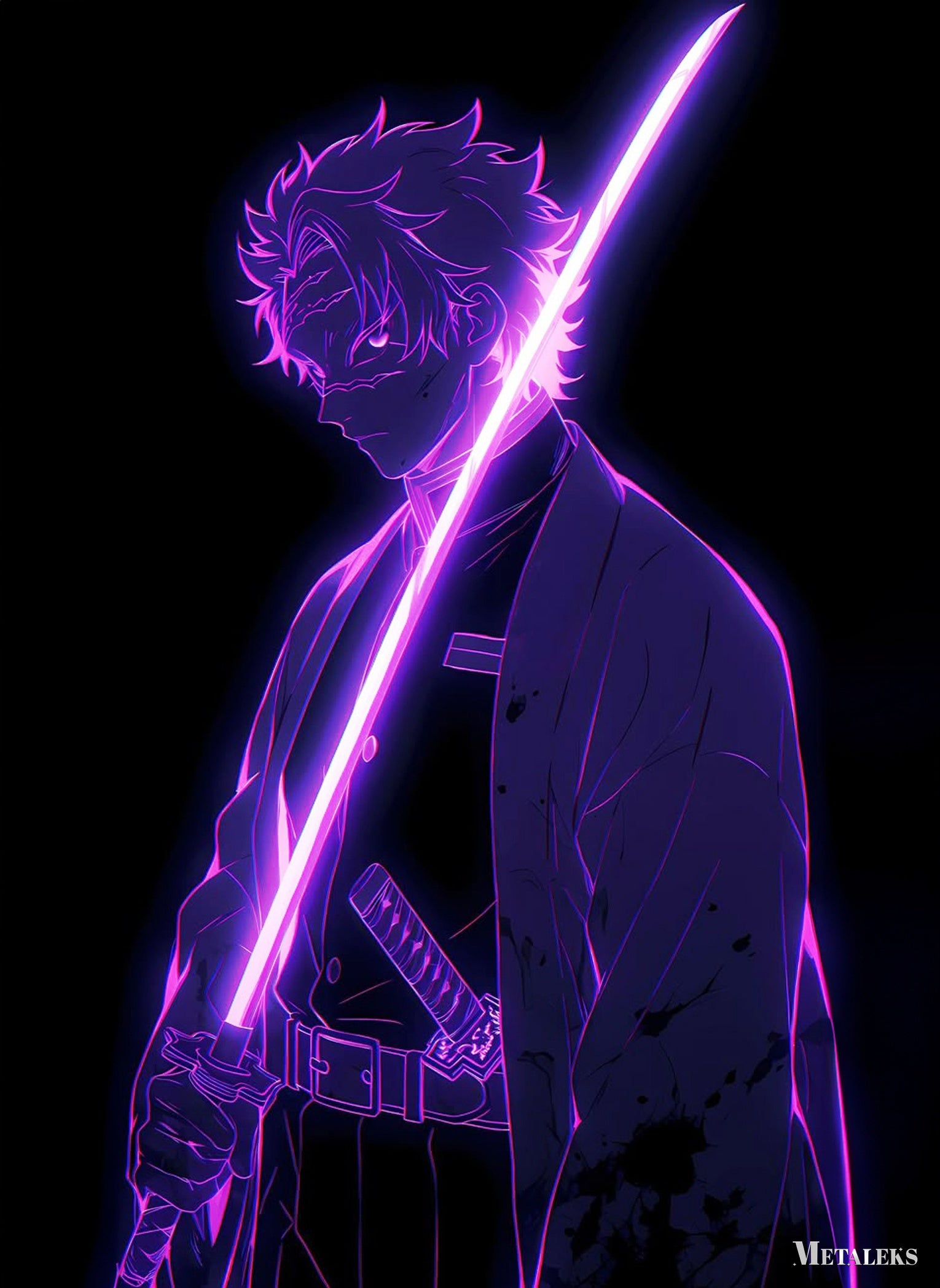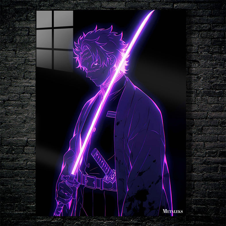 The character, a demon slayer from “Demon Slayer: Kimetsu no Yaiba,” holds a glowing pink sword. Metaleks Ultra HD Metal Poster – Create Your Passionate Space.