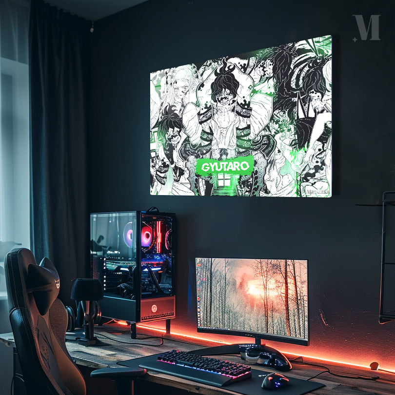 Gyutaro from Demon Slayer is surrounded by multiple versions of himself, each with distinct expressions and markings. Metaleks Ultra HD Metal Poster – Create Your Passionate Space.