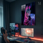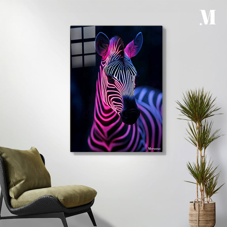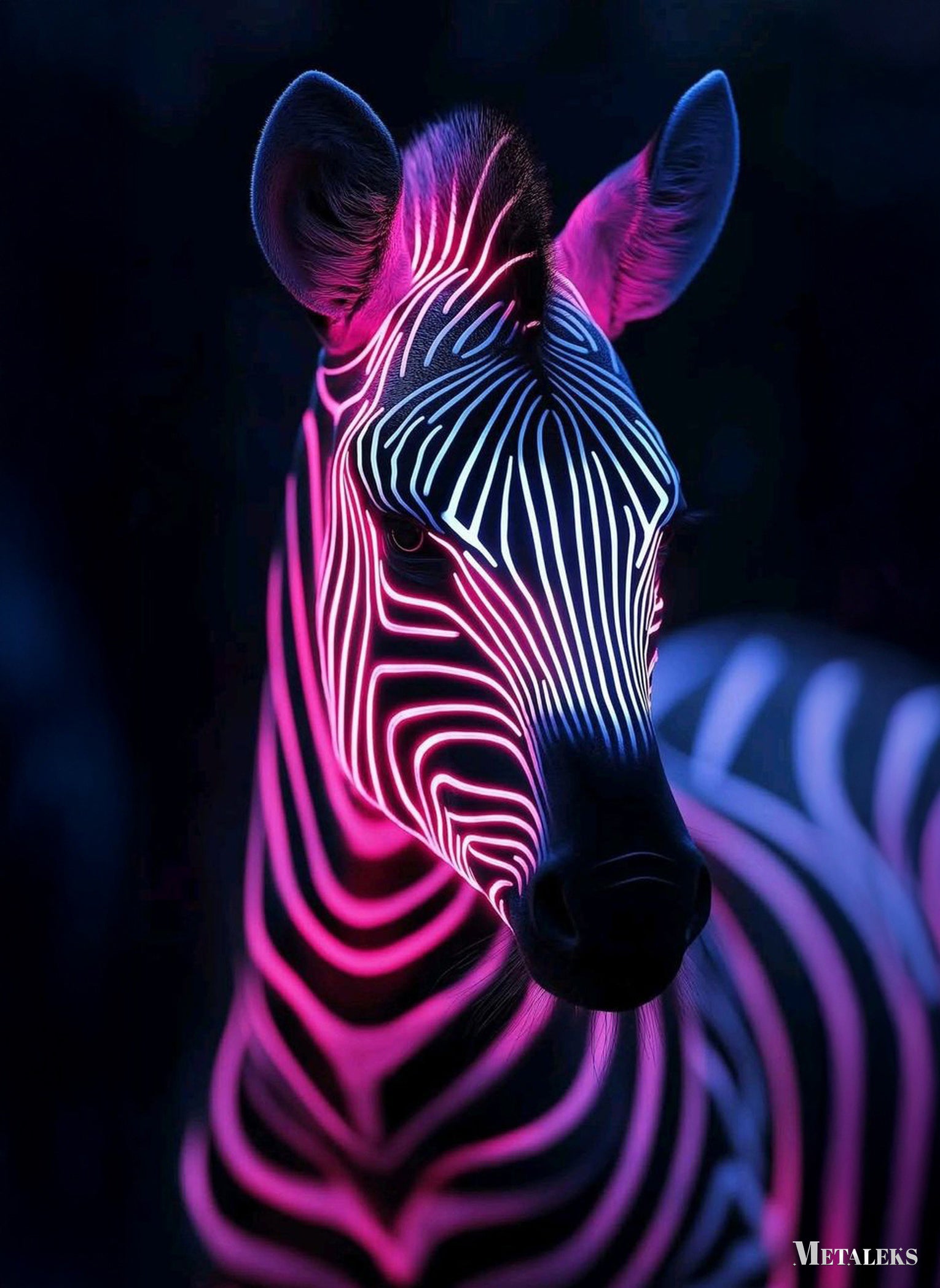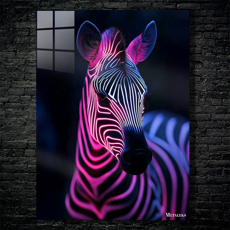 A zebra is illuminated with neon pink and blue lights, highlighting its distinctive stripes. Metaleks Ultra HD Metal Poster – Create Your Passionate Space.