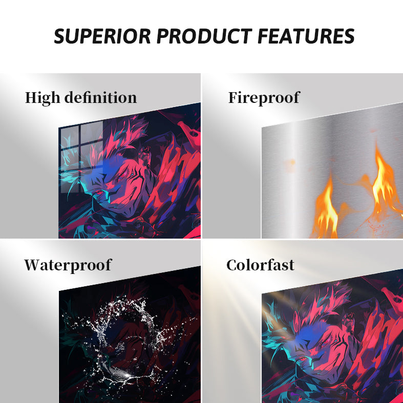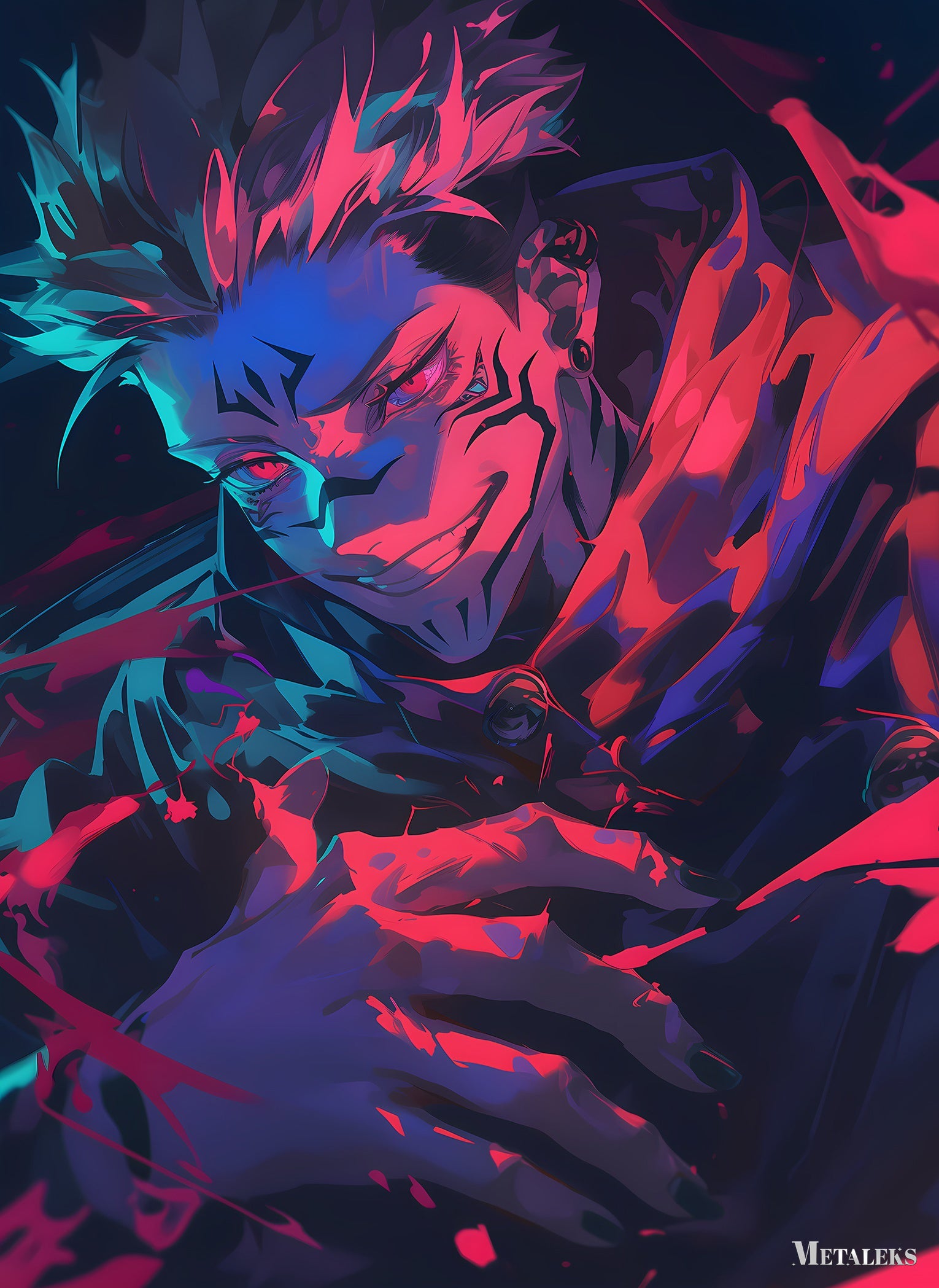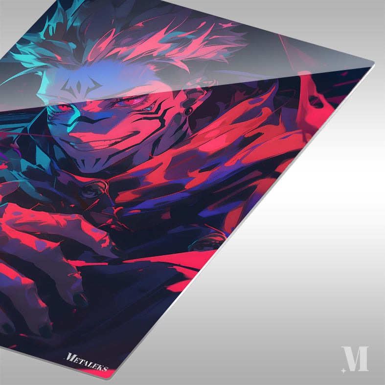 Ryomen Sukuna from Jujutsu Kaisen has spiky hair and red markings on his face. He is wearing a dark outfit and has red eyes. His hands are positioned in front of him, with red energy or blood around them. Metaleks Ultra HD Metal Poster – Create Your Passionate Space.