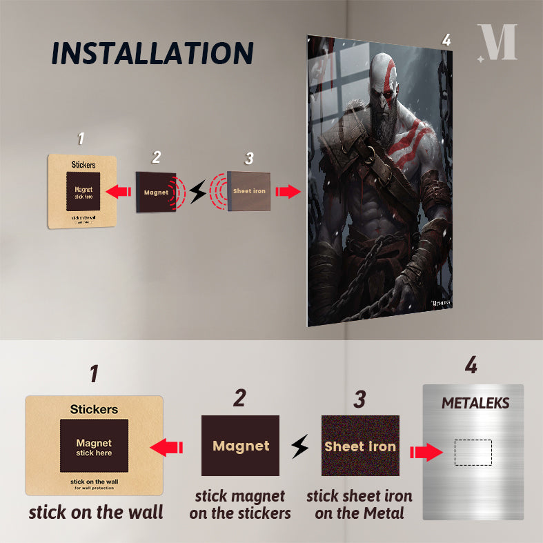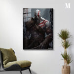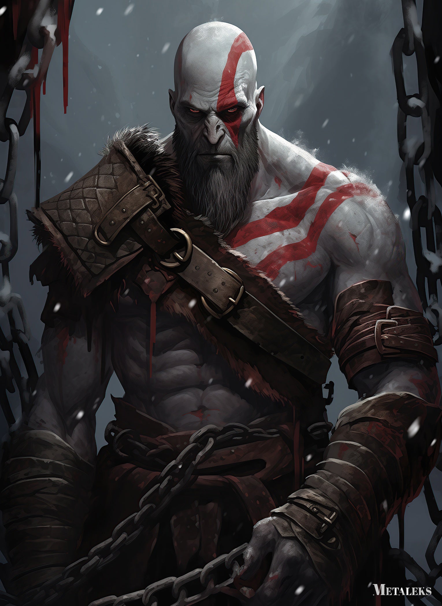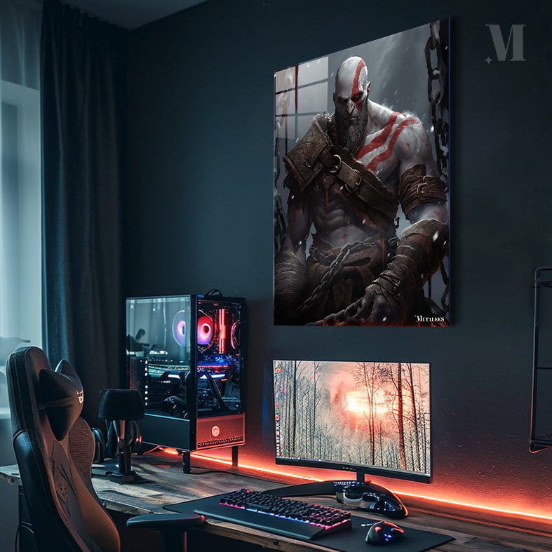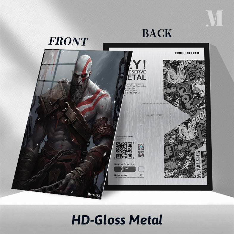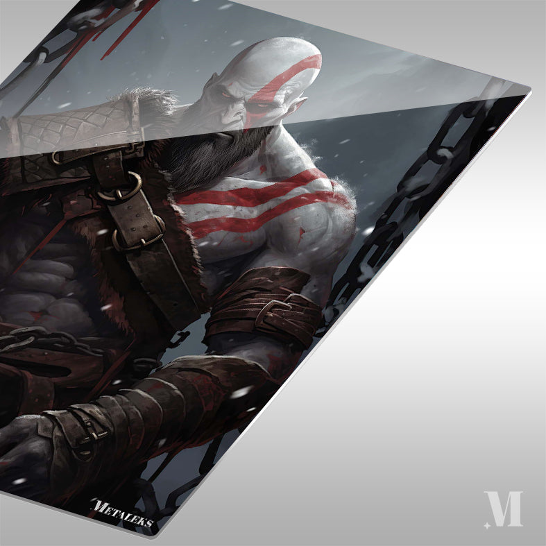 Kratos from God of War is depicted with a muscular build, wearing a fur-lined shoulder armor, arm bracers, and chains. His body is marked with red tattoos, and he has a stern expression. Metaleks Ultra HD Metal Poster – Create Your Passionate Space.