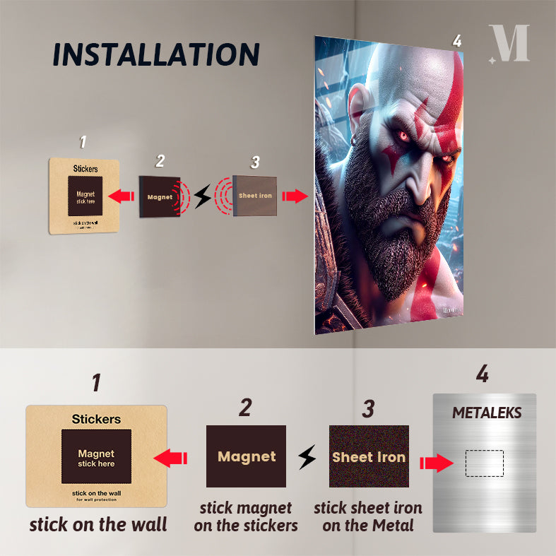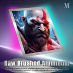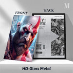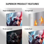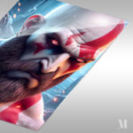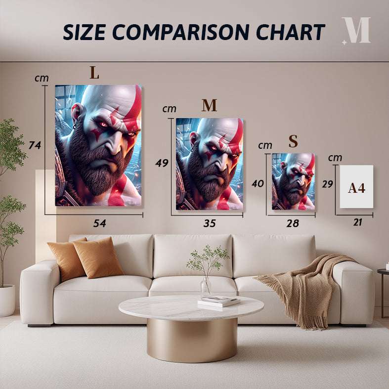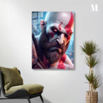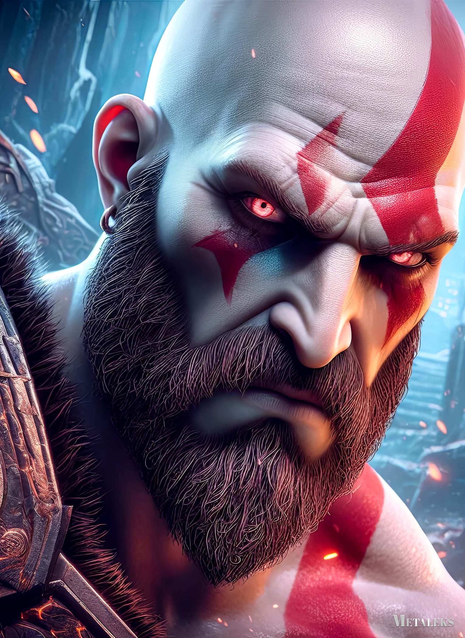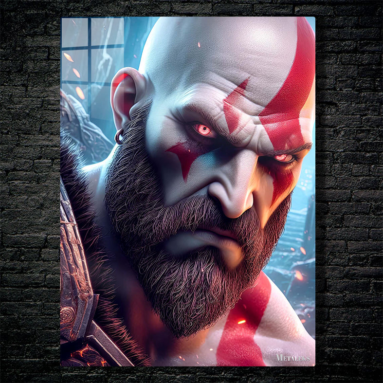 Kratos, the character from the “God of War” video game series, has a muscular build, a bald head, and a thick beard. His face is painted with red markings, and his eyes glow red. He appears intense and focused. Metaleks Ultra HD Metal Poster – Create Your Passionate Space.