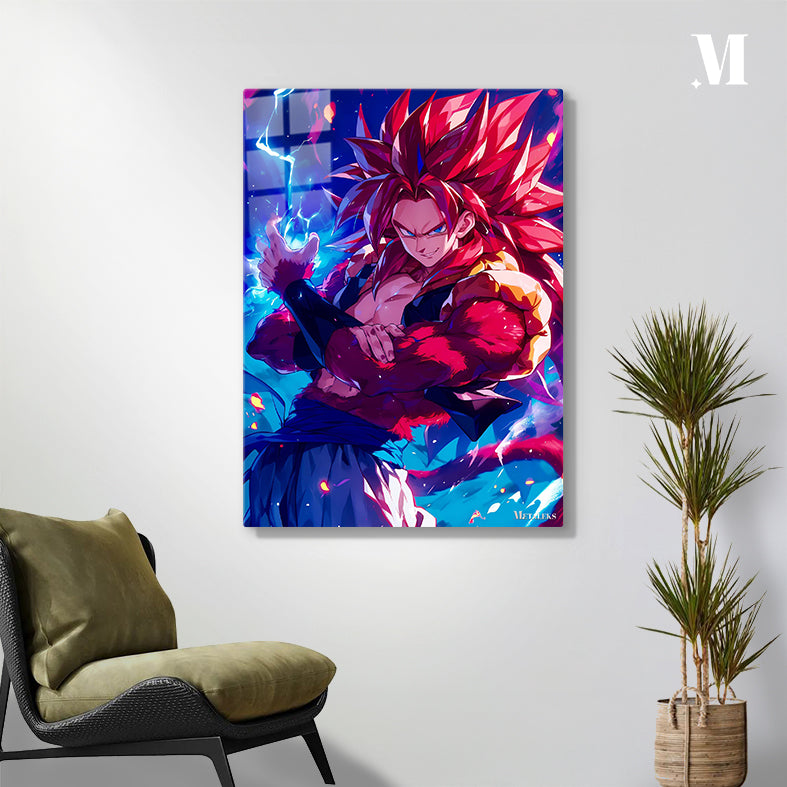 Goku from Dragon Ball is depicted with spiky red hair, wearing a red and black outfit, and has blue electricity around his hand. Metaleks Ultra HD Metal Poster – Create Your Passionate Space.