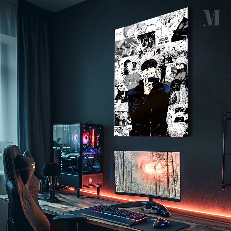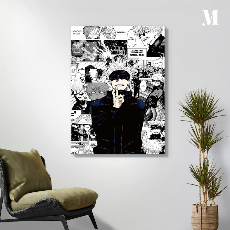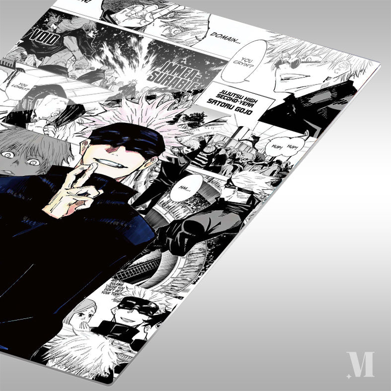 The image features panels from the manga *Jujutsu Kaisen*, with the main subject being Satoru Gojo, a second-year student at Jujutsu High, shown in various action and dialogue scenes. Metaleks Ultra HD Metal Poster – Create Your Passionate Space.