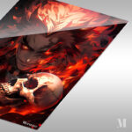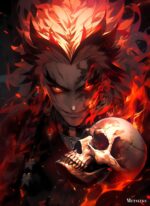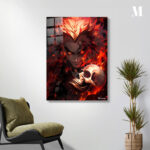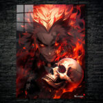 The image depicts Muzan Kibutsuji from the anime “Demon Slayer: Kimetsu no Yaiba.” He has a menacing expression with glowing red eyes and spiky, flame-like hair. He is holding a skull and is surrounded by flames. Metaleks Ultra HD Metal Poster – Create Your Passionate Space.