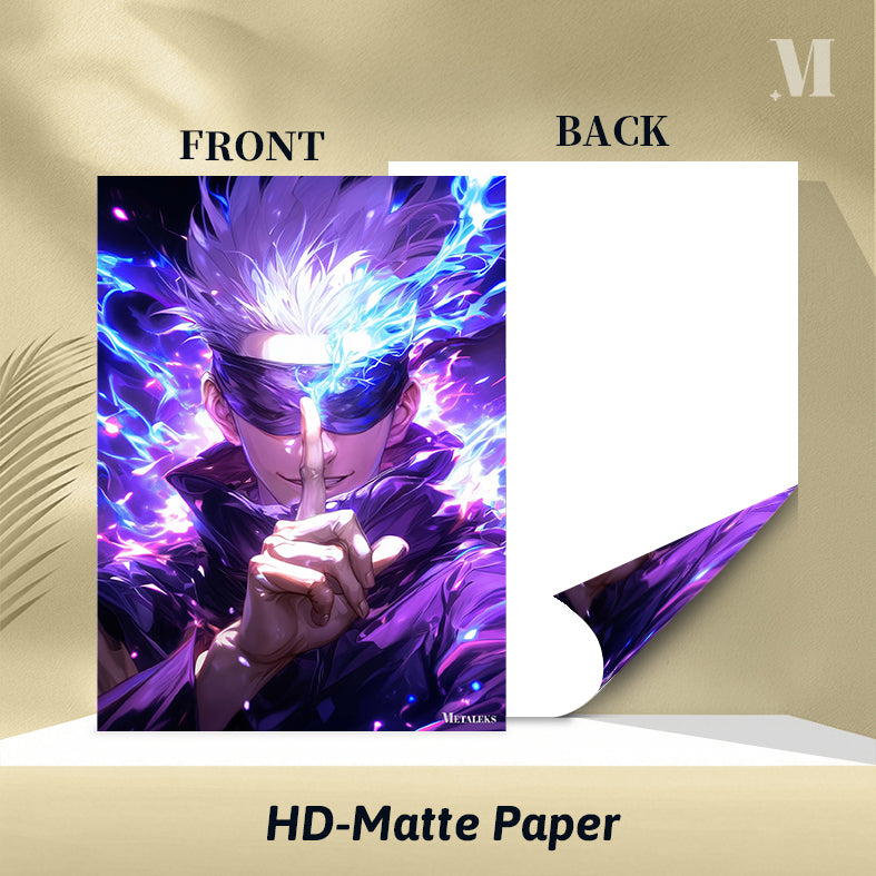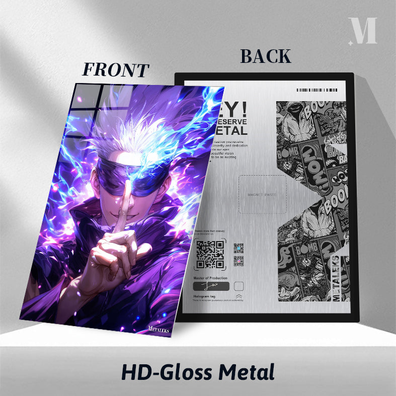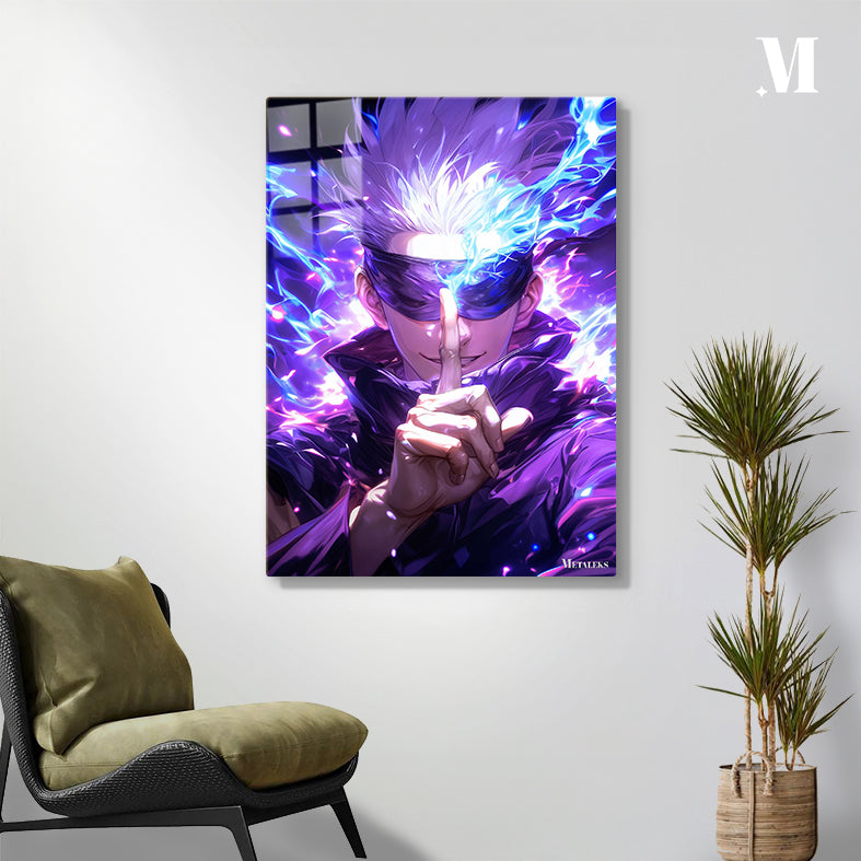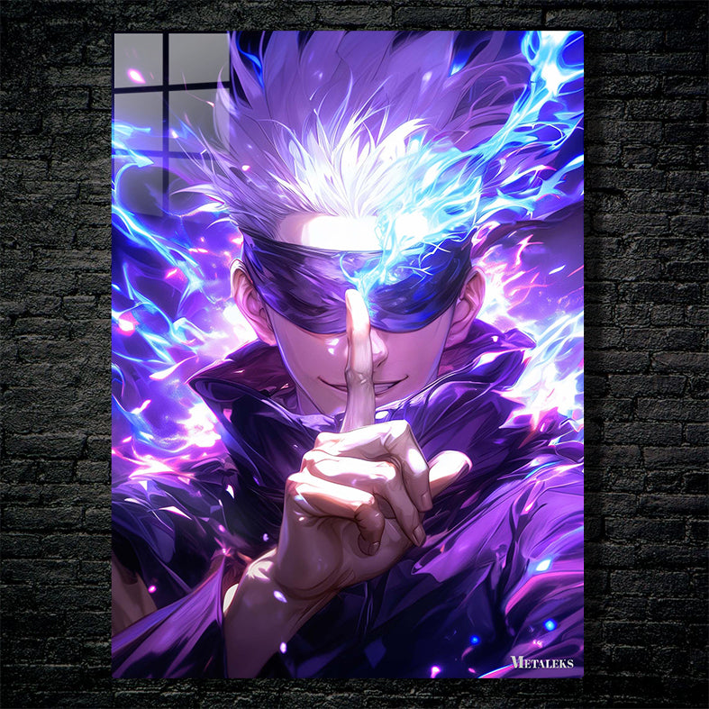 Gojo Satoru from Jujutsu Kaisen is shown with spiky white hair and a blindfold. He is making a hand gesture with his index finger pointing forward, surrounded by blue and purple energy. Metaleks Ultra HD Metal Poster – Create Your Passionate Space.
