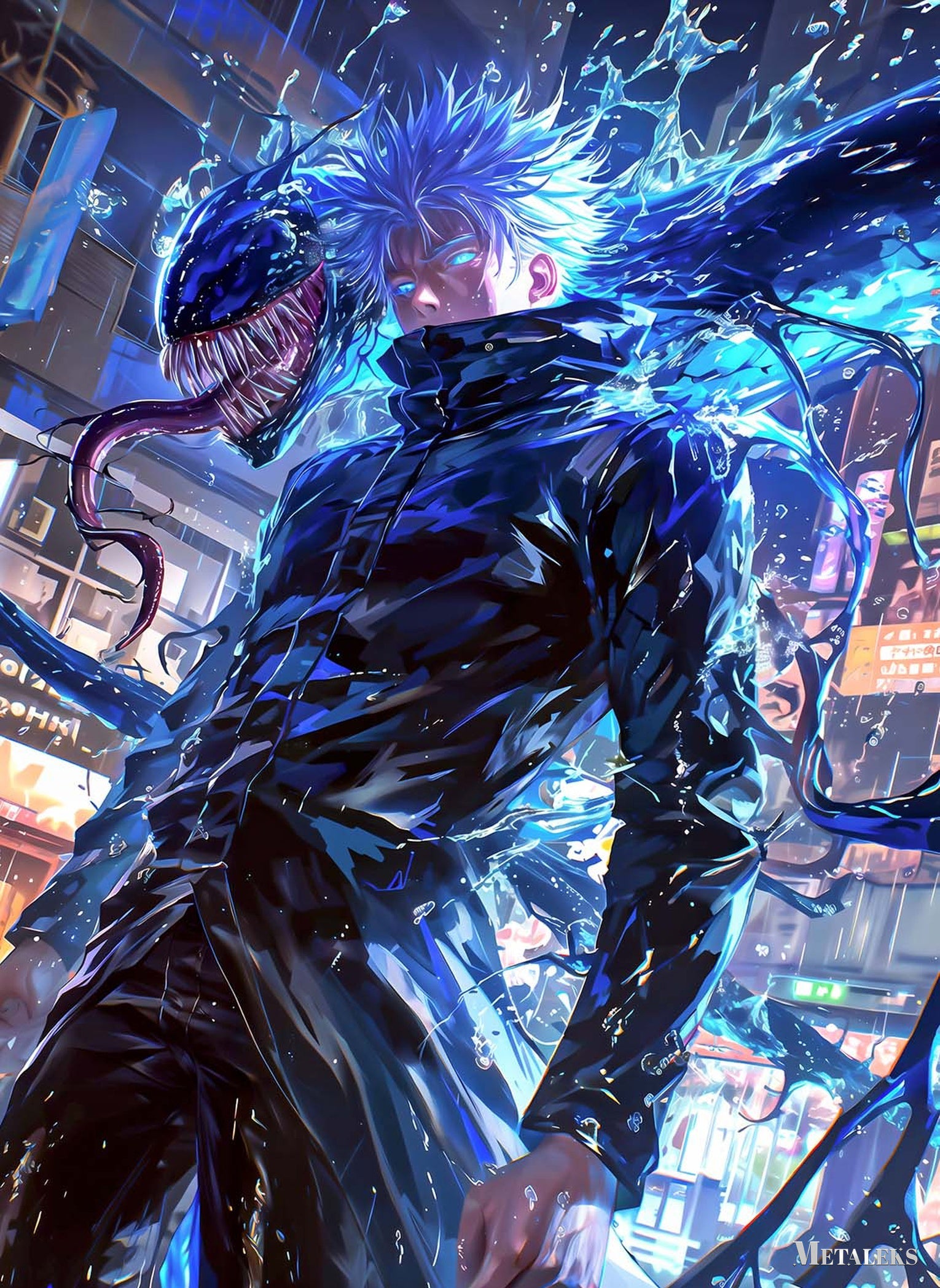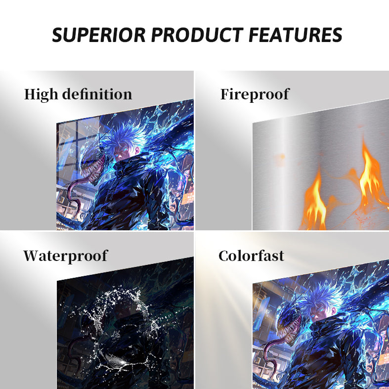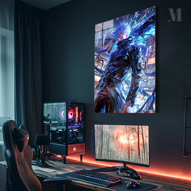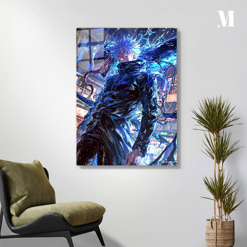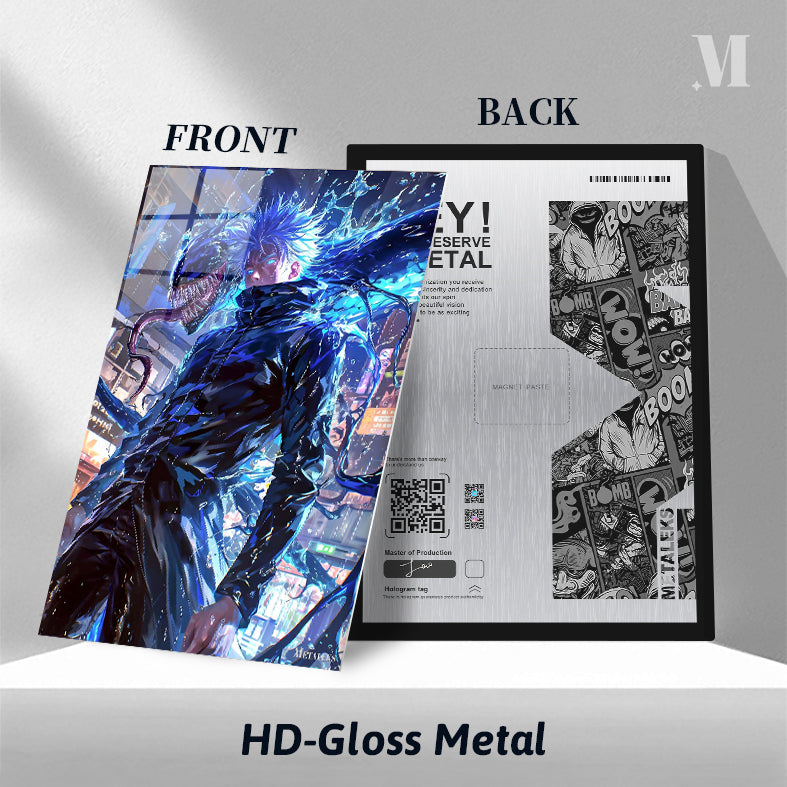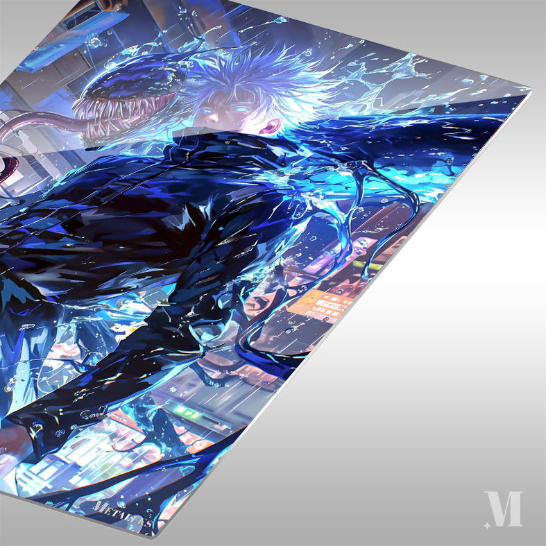 Gojo Satoru from “Jujutsu Kaisen” has spiky blue hair and is wearing a black outfit. A large, menacing creature with sharp teeth and a long tongue appears beside him. Metaleks Ultra HD Metal Poster – Create Your Passionate Space.