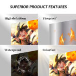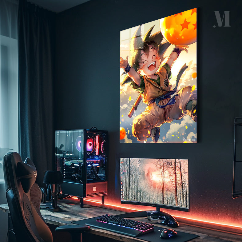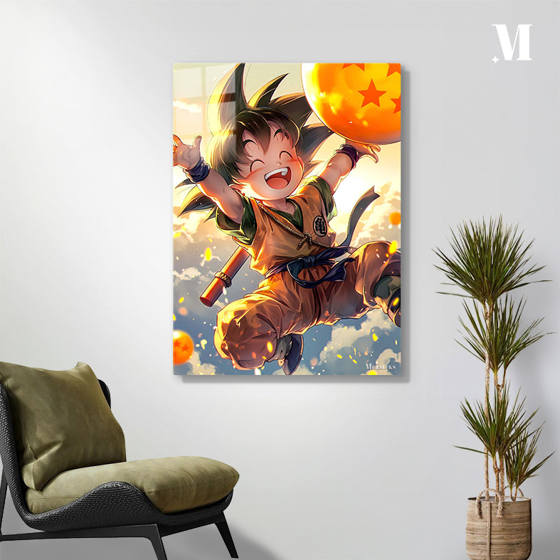 Son Goku from Dragon Ball is flying in the air with a wide smile on his face. He is holding a Dragon Ball with one hand and his arms are outstretched. Metaleks Ultra HD Metal Poster – Create Your Passionate Space.
