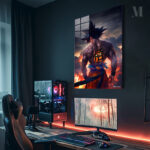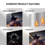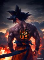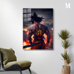 Goku from “Dragon Ball” is depicted from behind, showcasing his muscular build with the Chinese character “悟” on his back, against a backdrop of fiery clouds. Metaleks Ultra HD Metal Poster – Create Your Passionate Space.