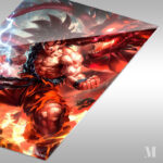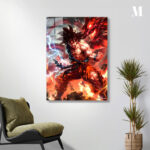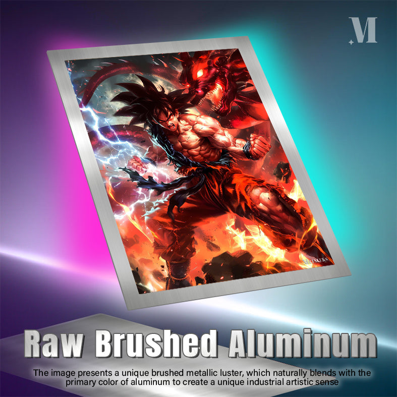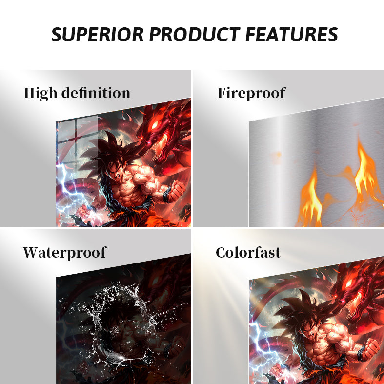 Goku from Dragon Ball is in a dynamic pose, with flames and electricity surrounding him, and a fierce dragon behind him. Metaleks Ultra HD Metal Poster – Create Your Passionate Space.