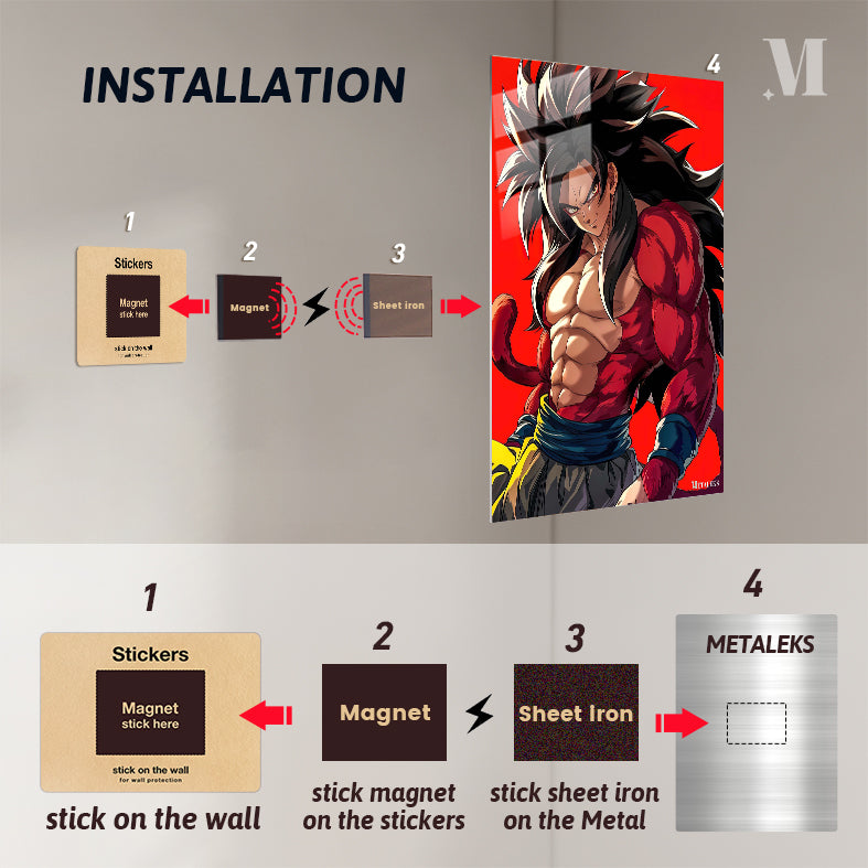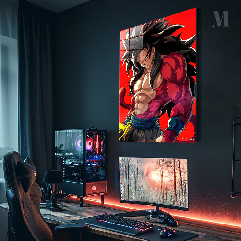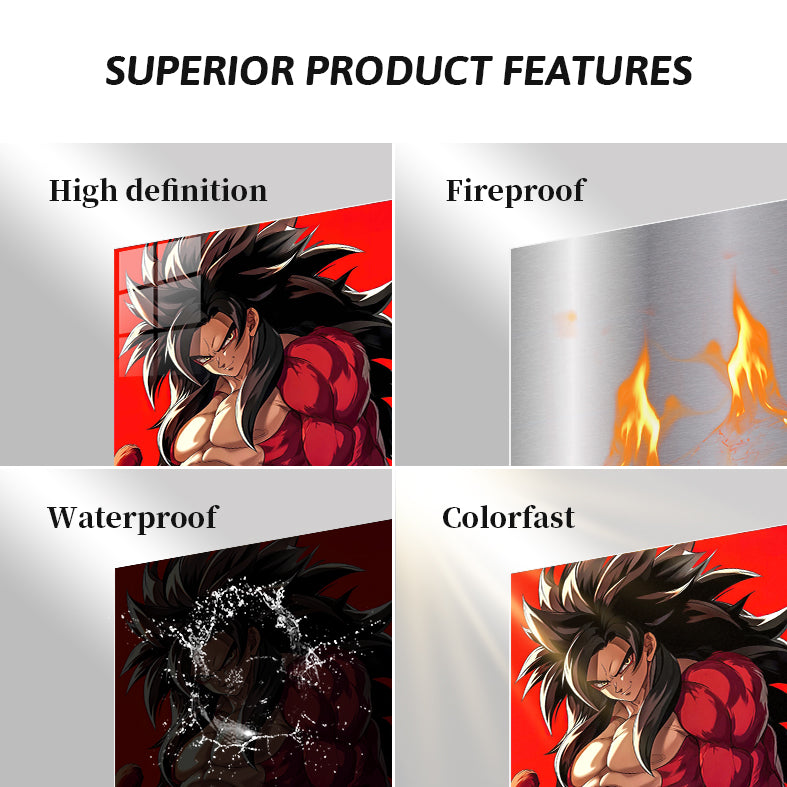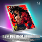 Goku from Dragon Ball has long black hair and a muscular build. He is wearing a red and yellow outfit with a blue belt. Metaleks Ultra HD Metal Poster – Create Your Passionate Space.