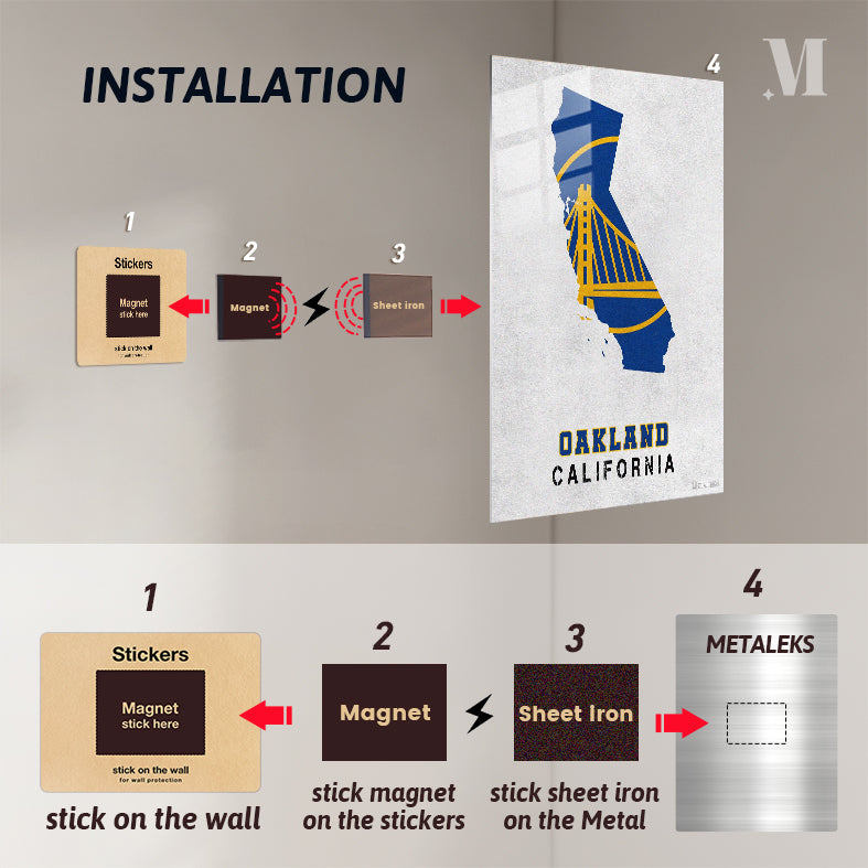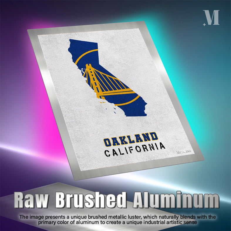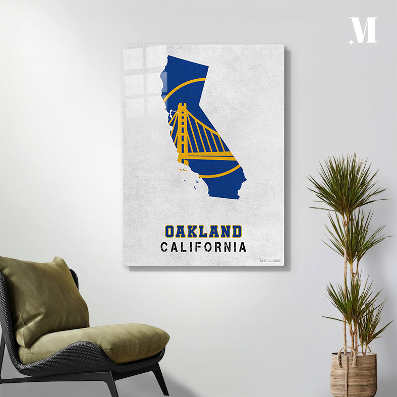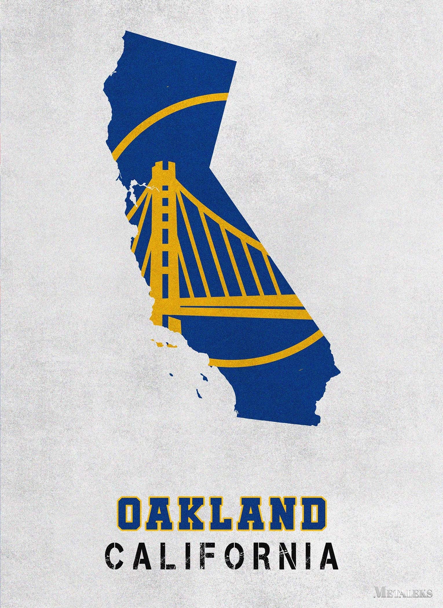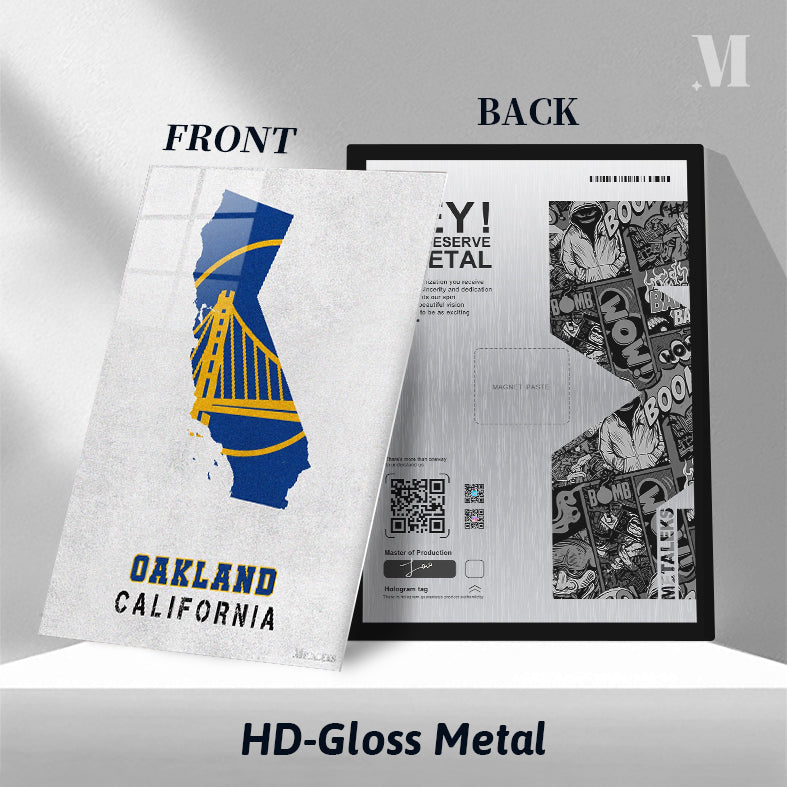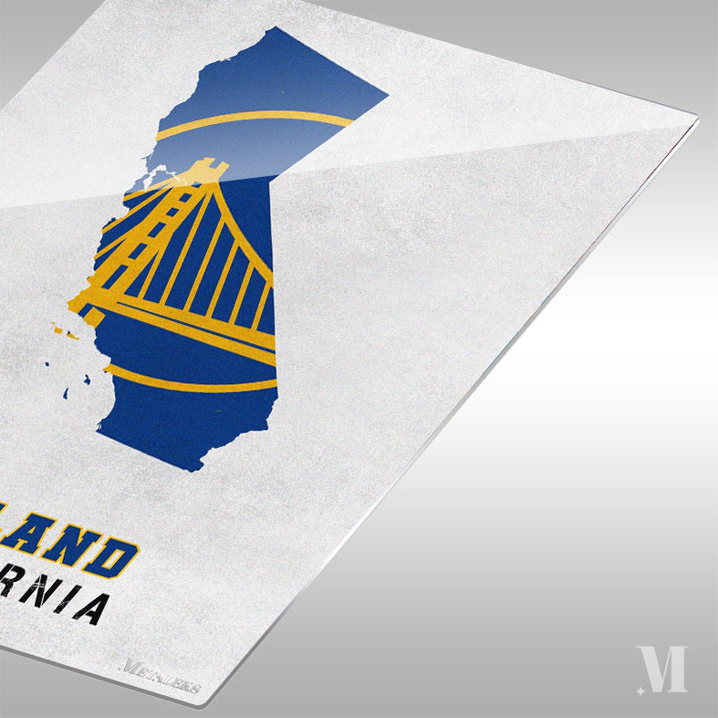 The image features a stylized map of California in blue and yellow, with a prominent Golden Gate Bridge design. Below the map, the text “OAKLAND CALIFORNIA” is displayed. Metaleks Ultra HD Metal Poster – Create Your Passionate Space.