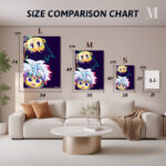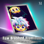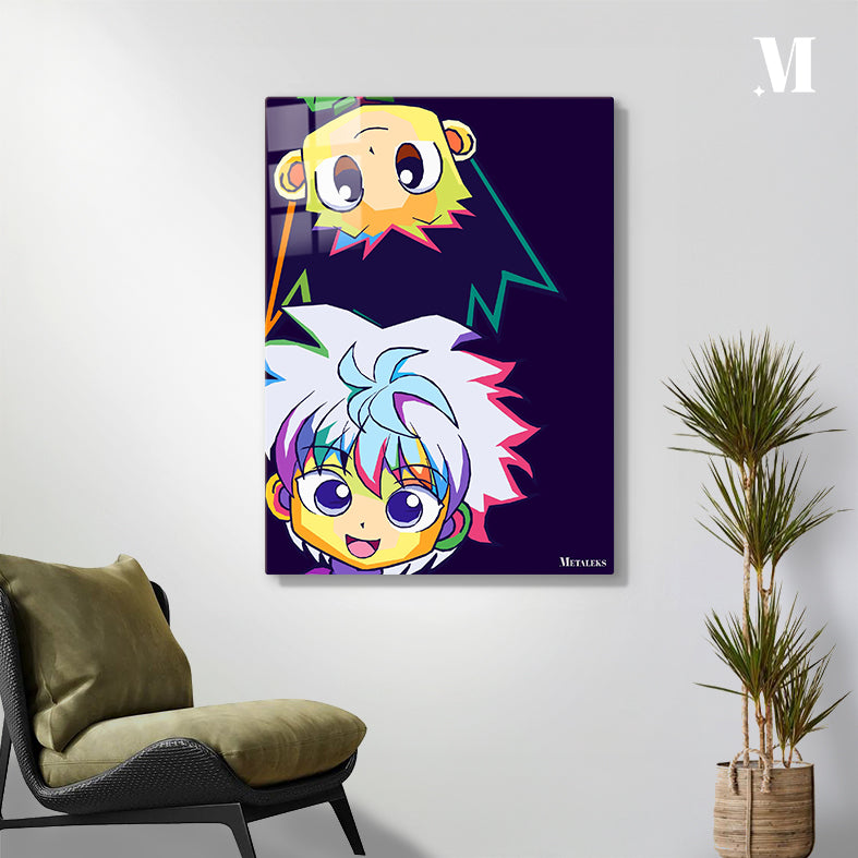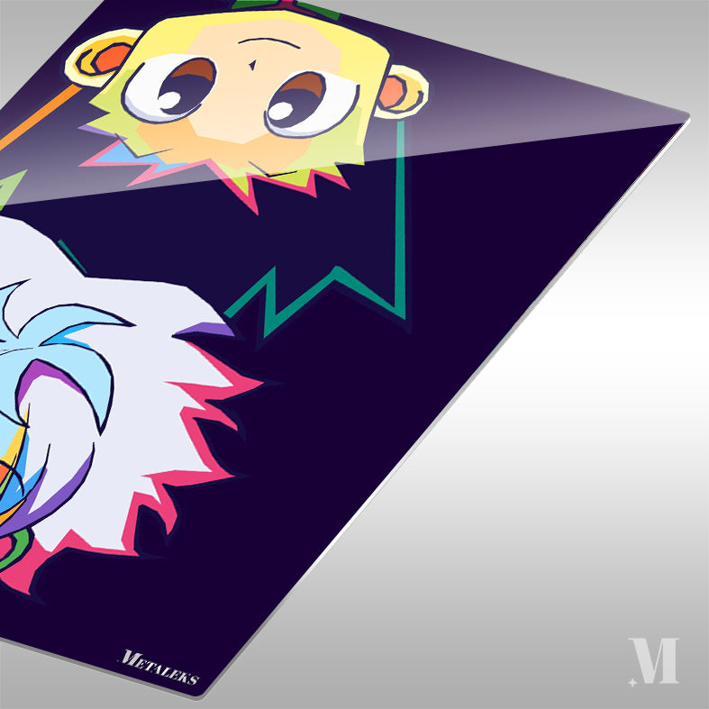 A colorful, animated character with spiky hair and large eyes is looking upwards. Another similar character with white and blue hair is smiling and looking forward. Metaleks Ultra HD Metal Poster – Create Your Passionate Space.