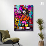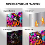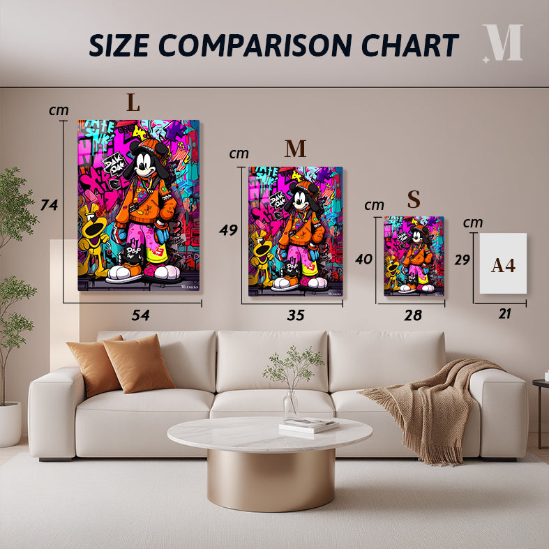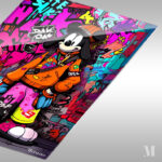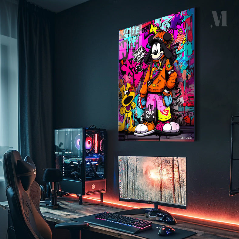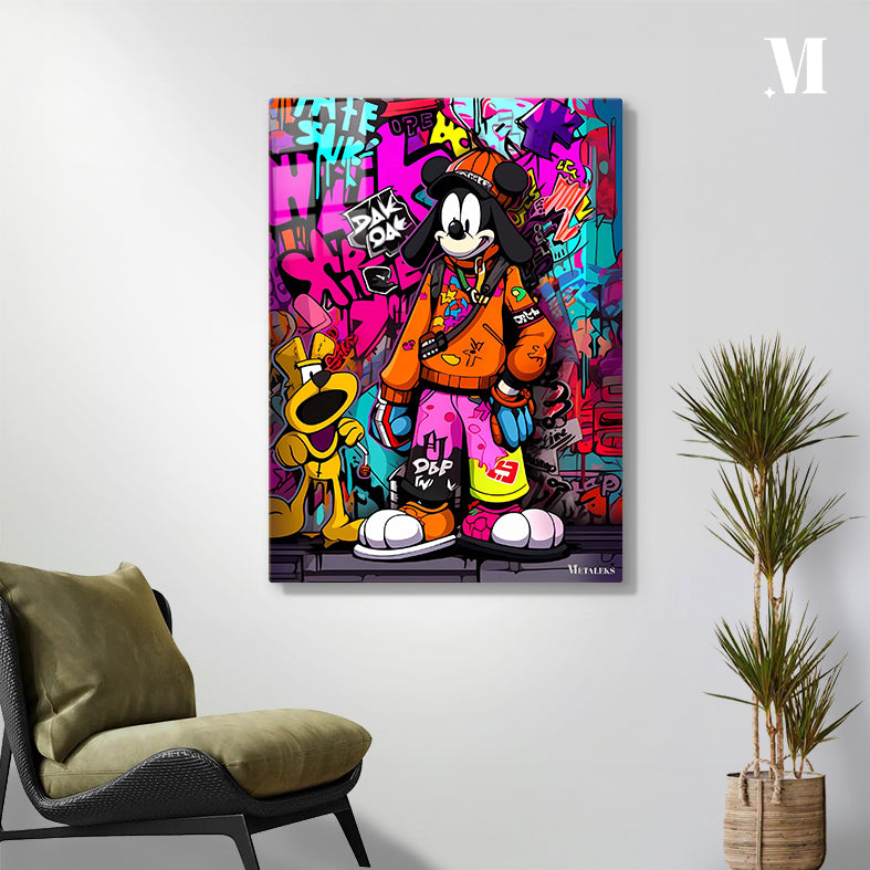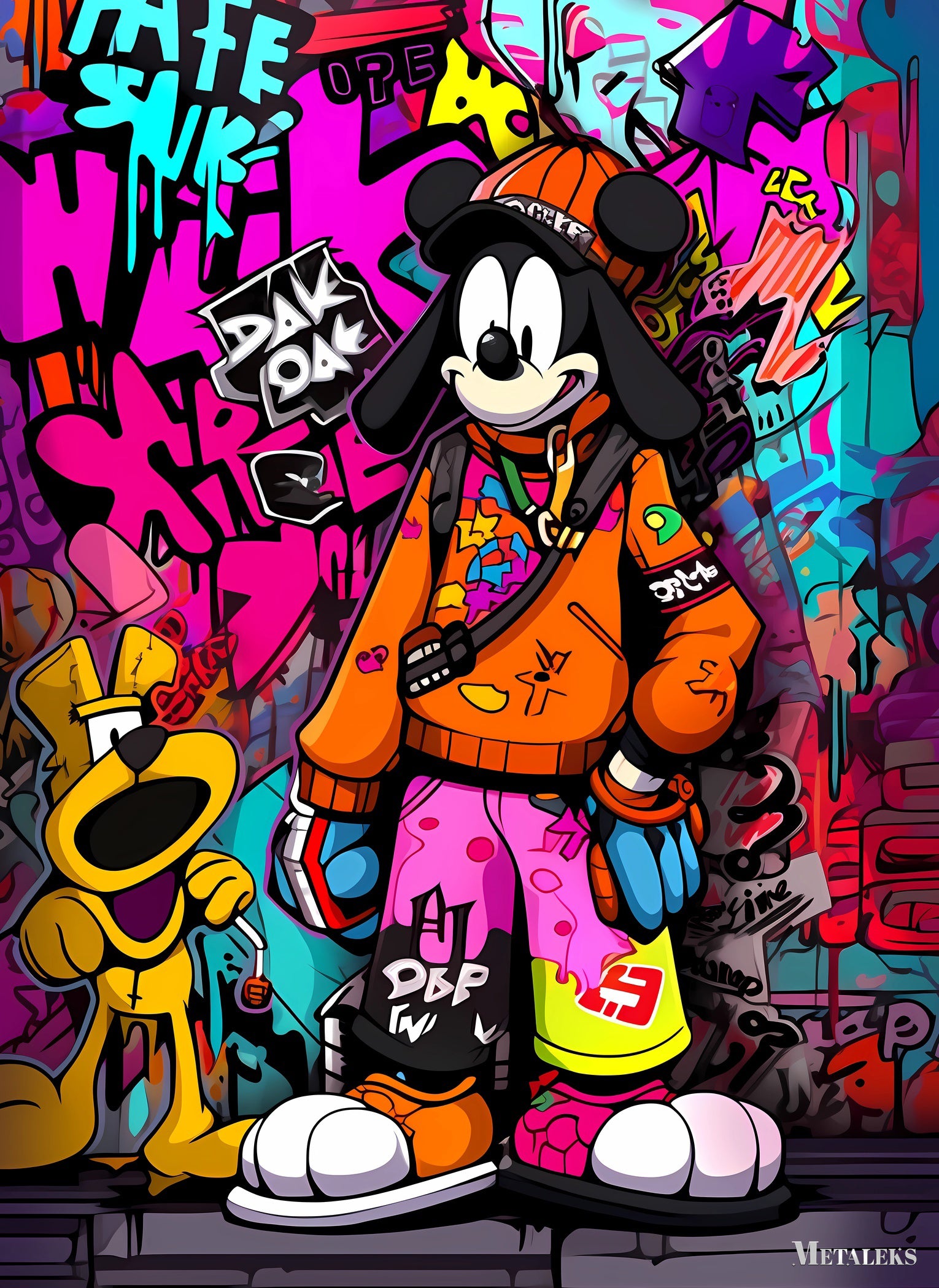 Goofy from Disney stands against a vibrant graffiti-covered wall, wearing an orange hoodie, colorful pants, and sneakers. Pluto, also from Disney, stands beside him, looking excited. Metaleks Ultra HD Metal Poster – Create Your Passionate Space.