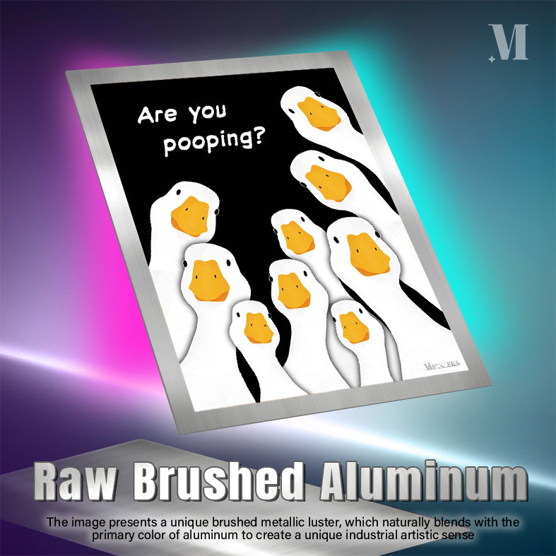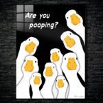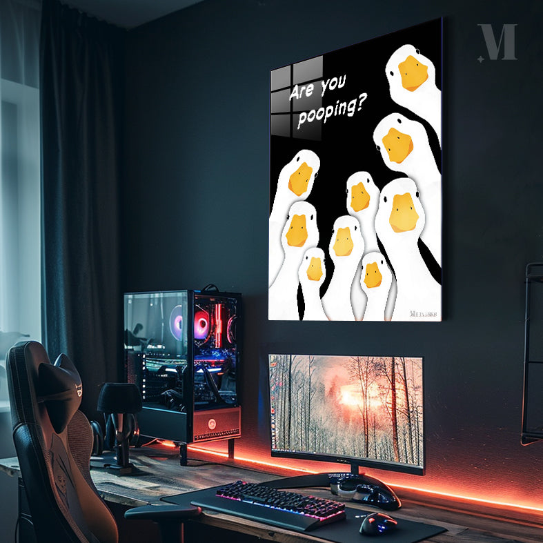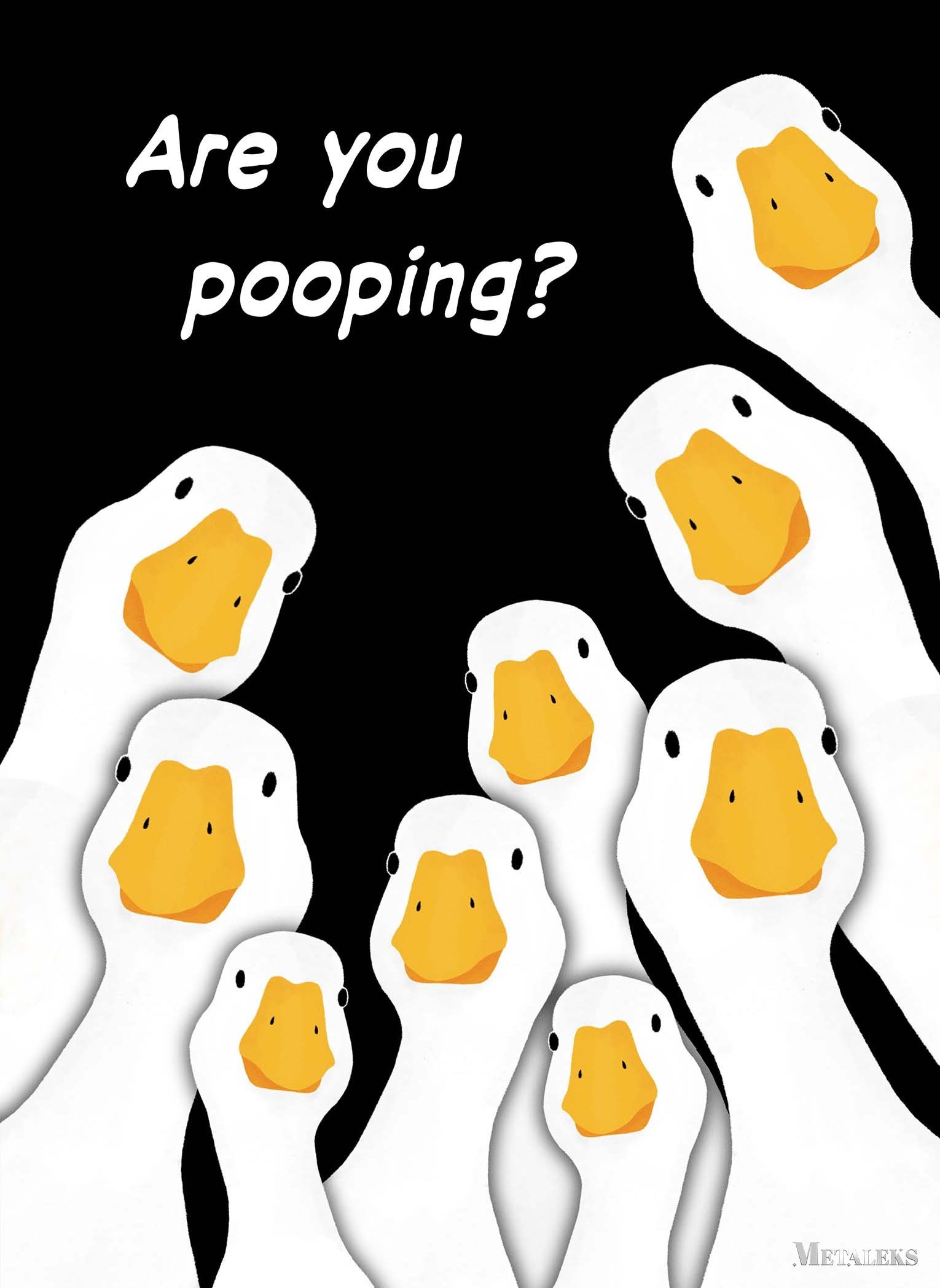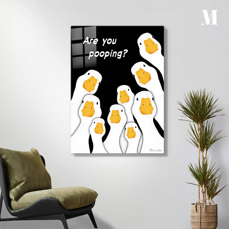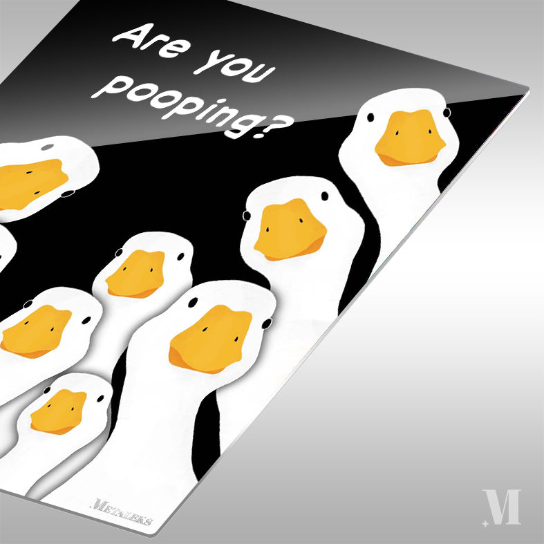 The image features a group of cartoon geese with white bodies and orange beaks. The geese are arranged in a semi-circle, looking upwards. Above them, there is a text that reads “Are you pooping?” in white letters. Metaleks Ultra HD Metal Poster – Create Your Passionate Space.