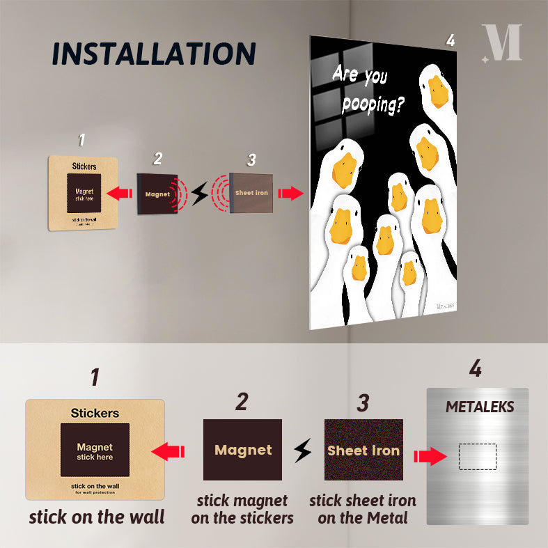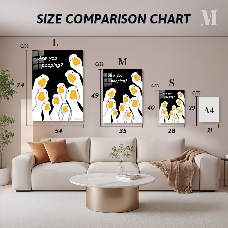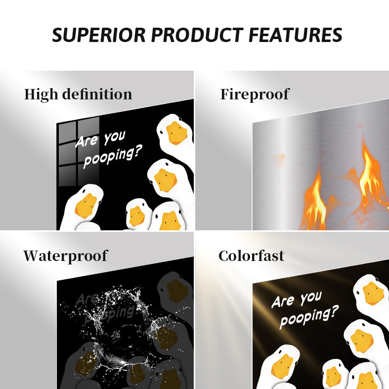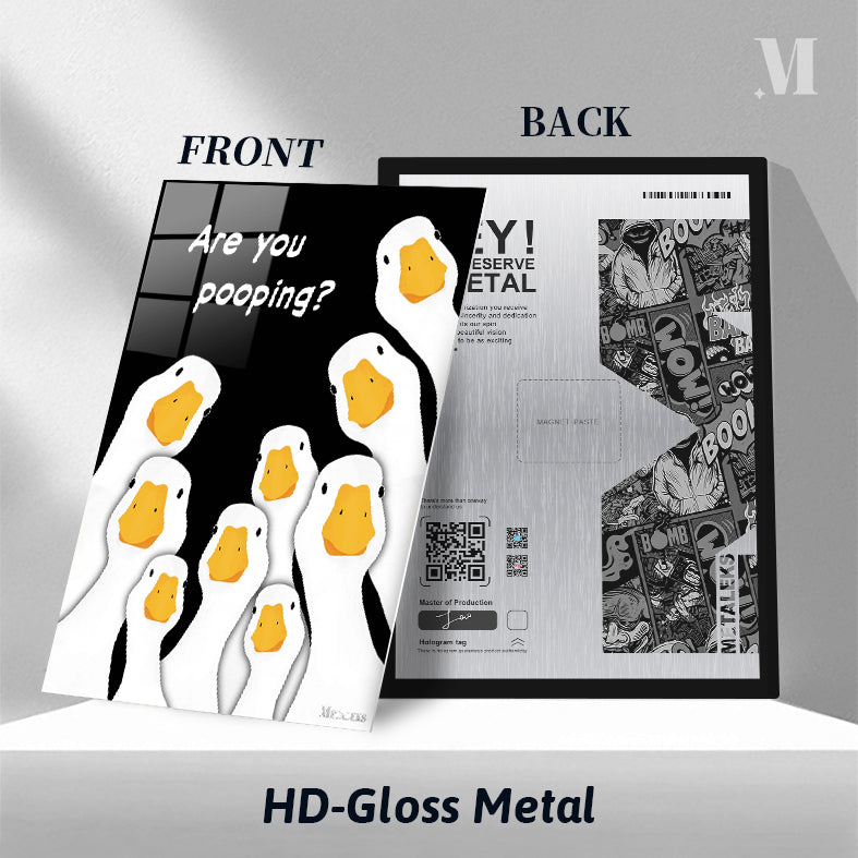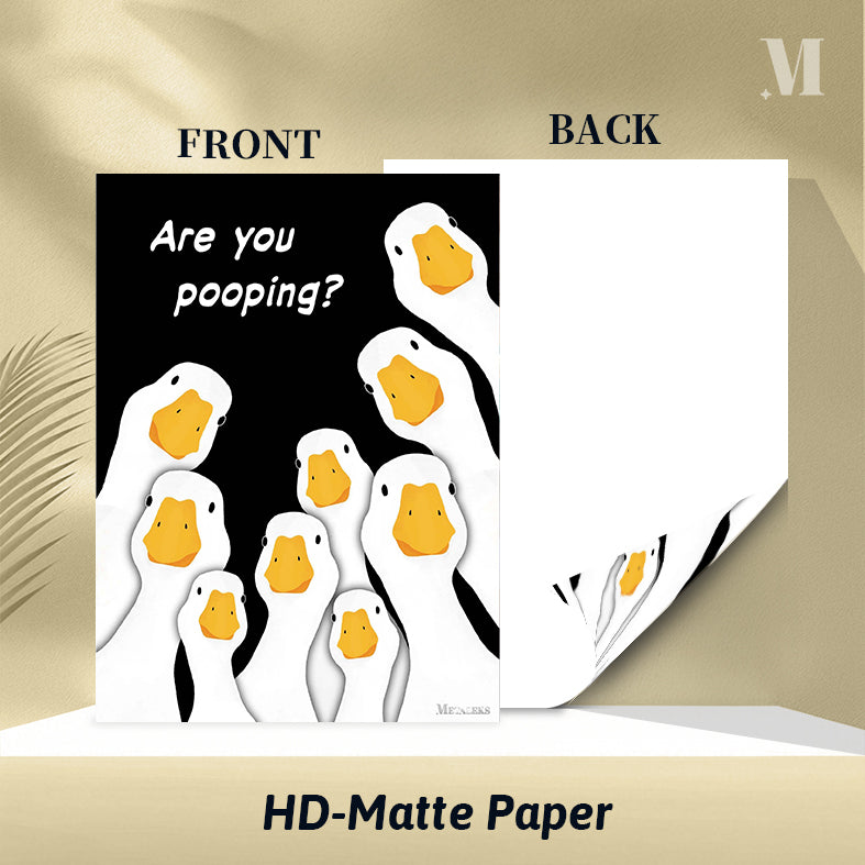 The image features a group of cartoon geese with white bodies and orange beaks. The geese are arranged in a semi-circle, looking upwards. Above them, there is a text that reads “Are you pooping?” in white letters. Metaleks Ultra HD Metal Poster – Create Your Passionate Space.