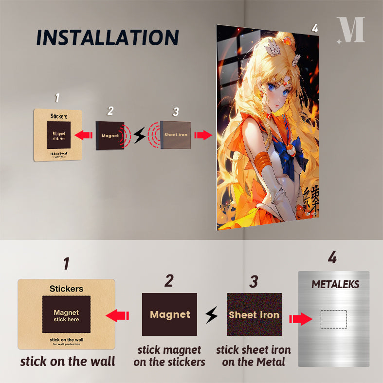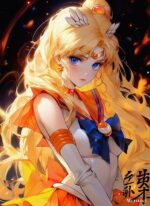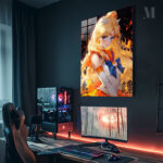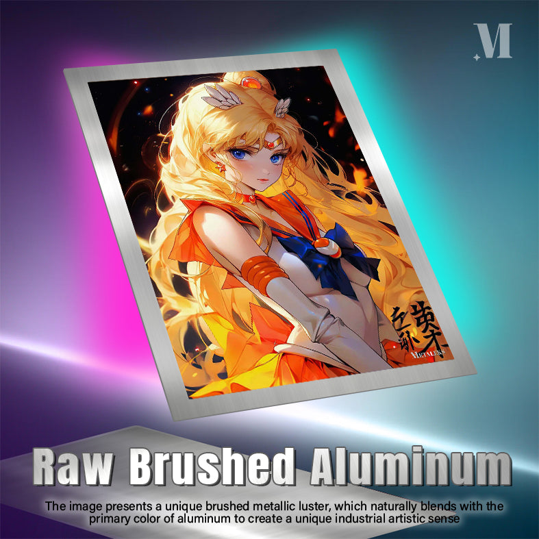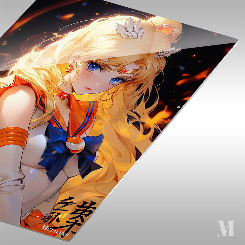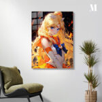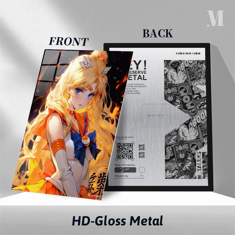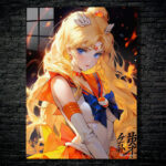 The image features Sailor Moon from the anime “Sailor Moon.” She has long blonde hair, blue eyes, and is wearing her iconic sailor suit with an orange and blue color scheme. Metaleks Ultra HD Metal Poster – Create Your Passionate Space.
