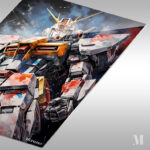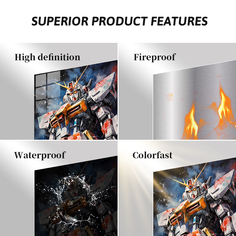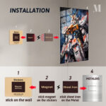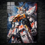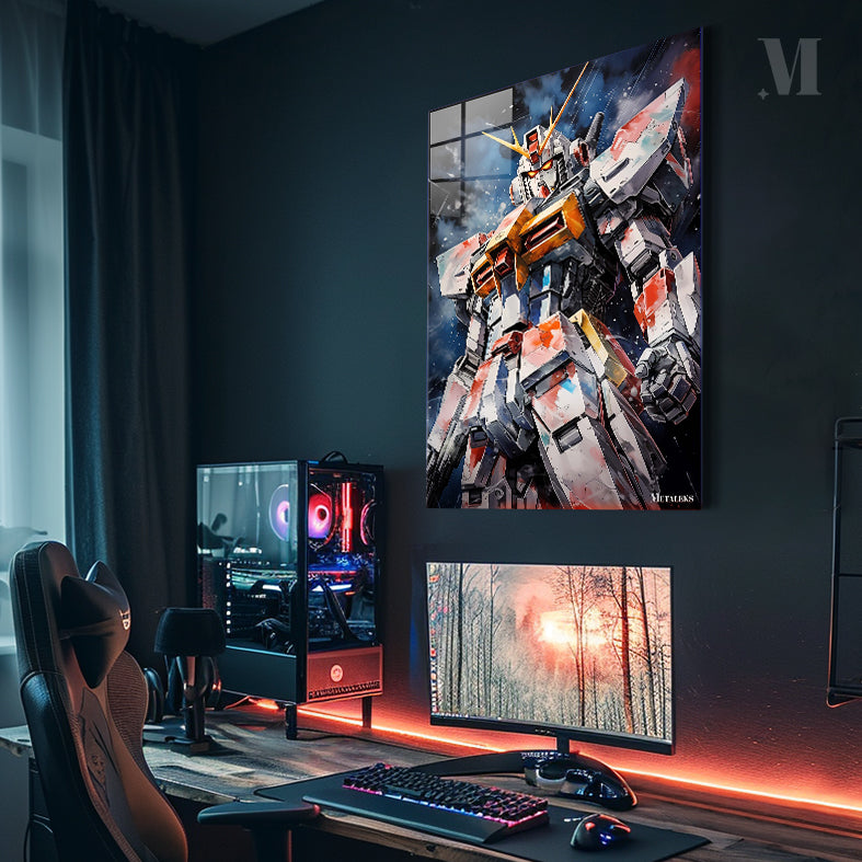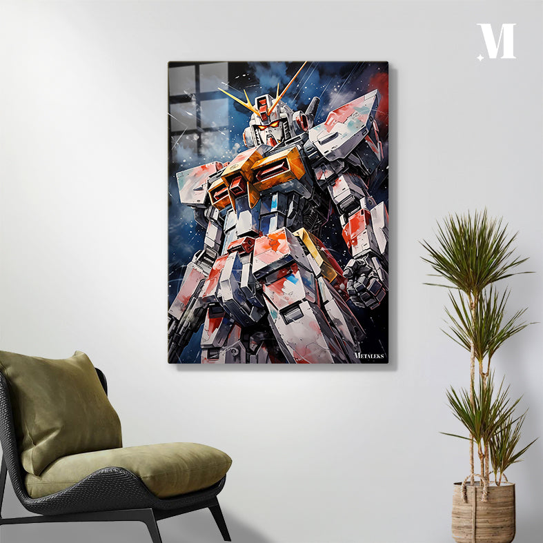 A large, detailed robot with a white, red, and yellow color scheme. It has a helmet with yellow horns and glowing red eyes. The robot’s body is heavily armored with various panels and mechanical details. Metaleks Ultra HD Metal Poster – Create Your Passionate Space.
