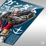 The image features the RX-78-2 Gundam from the “Mobile Suit Gundam” anime series. It is depicted holding a gun and a shield.